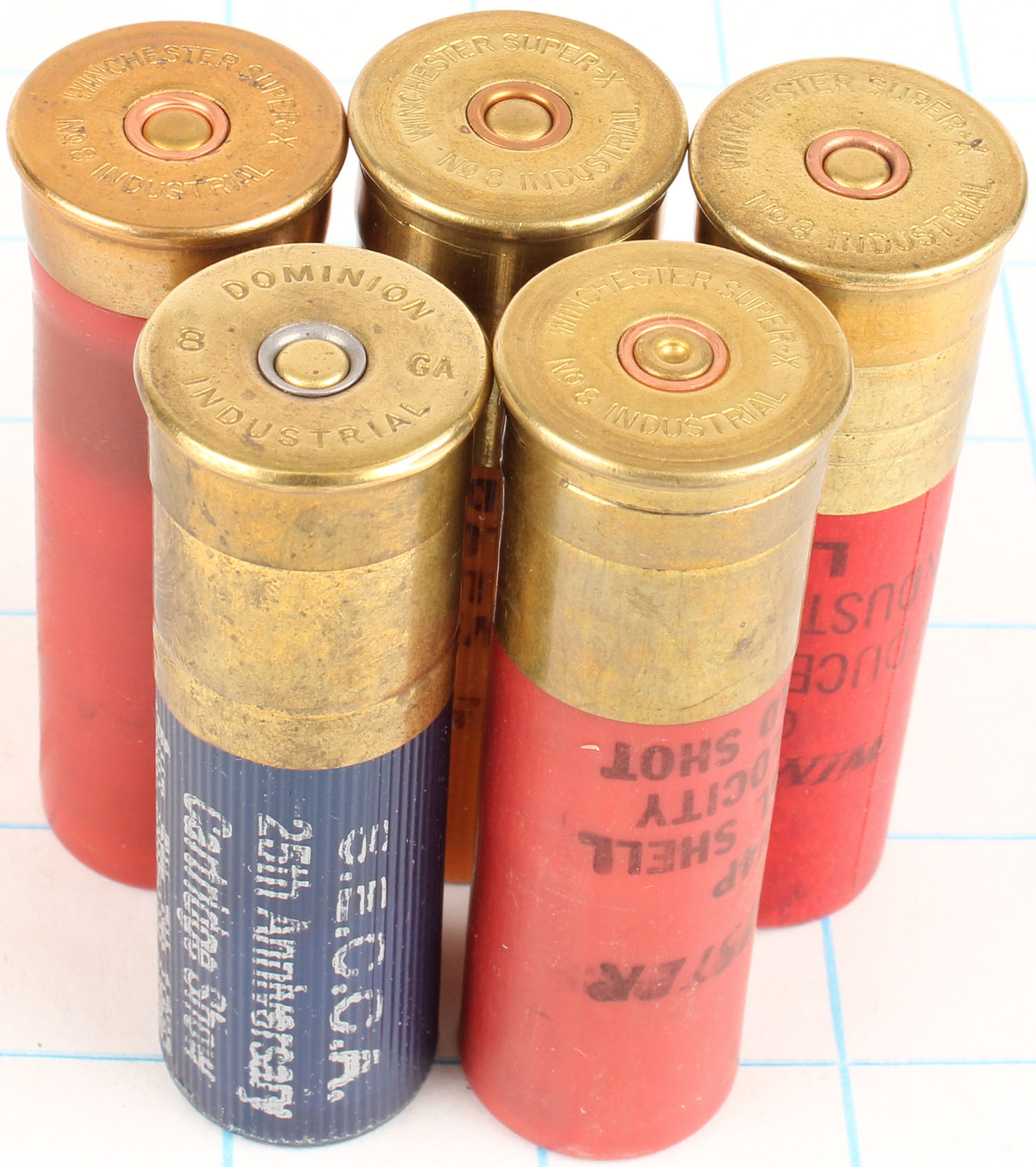 Lot of 5 loaded shotshells, mixed H/S, 8ga, 3'' OAL. Grade: Very Good ++ - Value: 10 to 50