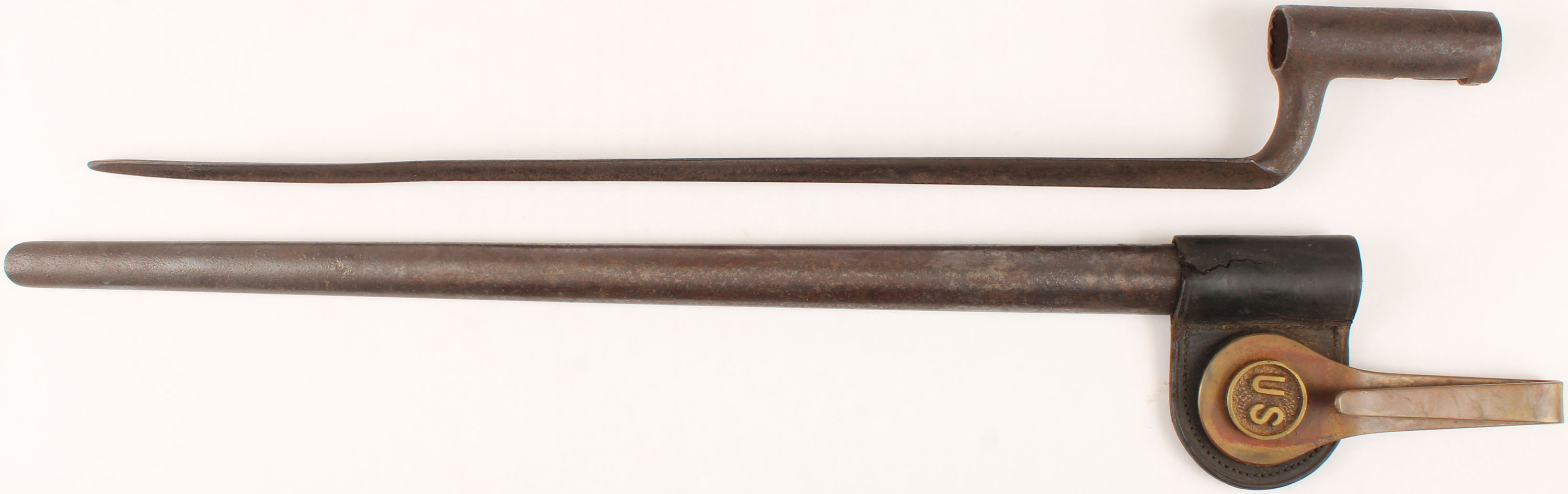 US, M1816/27 socket bayonet, Blade is marked ''J'', ''I'', blade has wear from the sheath & has brown patina, comes with sheath & leather frog, based on the location of the makers initials & the neck diameter this bayonet was likely made between 1827-1831 making this bayonet almost 200 Years old. Grade: Very Good - Value: 100 to 300