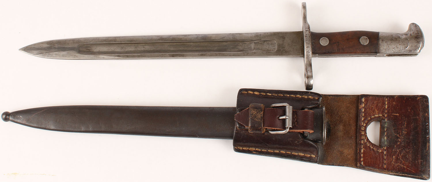 Swiss/ Waffenfabrik Neuhausen, M1899 Bayonet, right side of blade is marked ''WAFFENFABR'', ''NEUHAUSE'', right side of guard is marked ''318153'', comes with metal sheath & leather frog, blade has wear from use but no rust or patina. Grade; Excellent - Value: 100 to 200