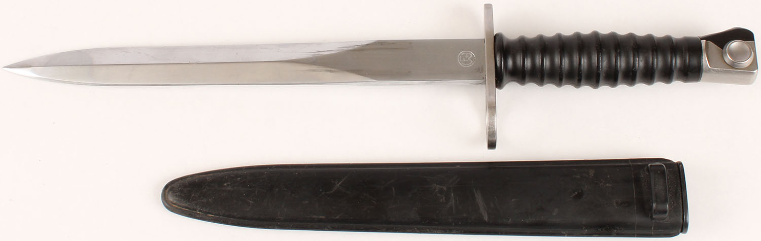 Swiss, M1957 Bayonet, Left side of blade is marked, ''W'', ''75253'', right side of blade is marked, ''F' over ''+W'' in a circle, comes with plastic sheath. Grade: Excellent ++ - Value: 30 to 60