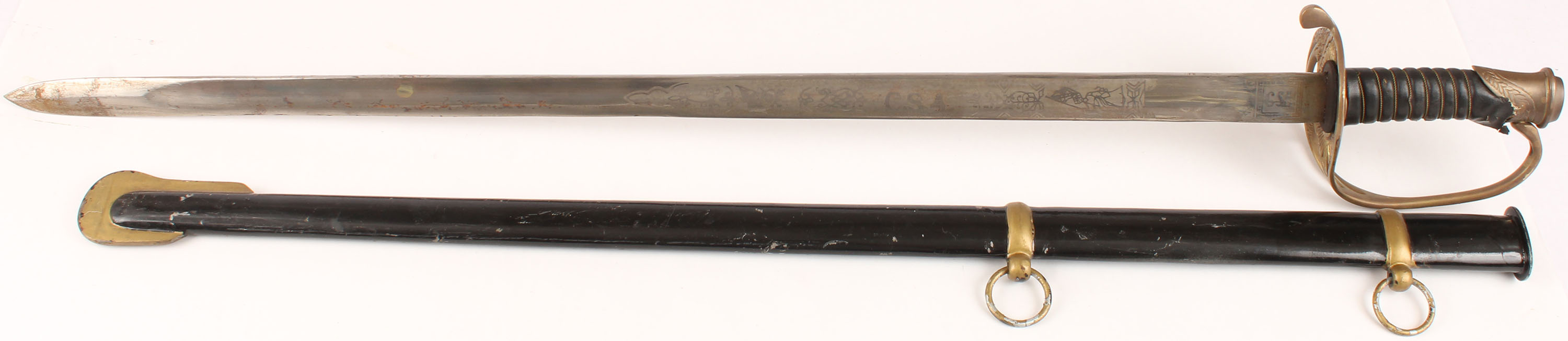 C.S.A., Reproduction M1850 Union Staff & Field sword, both sides of blade are marked ''C.S.A'', & have light engravings, blade has light rust speckling & light wear, comes with scabbard. Grade: Very Good ++ - Value: 20 to 100
