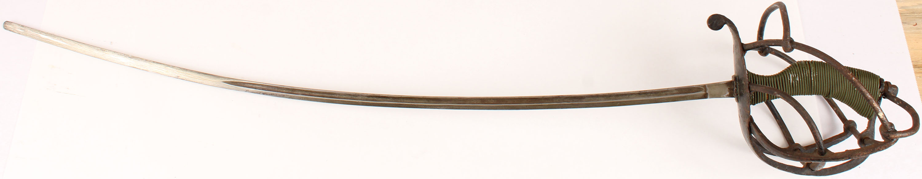 Antique French Rapier, blade has no markings, blade is covered in a lacquer paint, guard has wear & rust spots, modern paracord wrapped grip, round tip likely made for just fencing. Grade: Very Good + - Value: 40 to 120