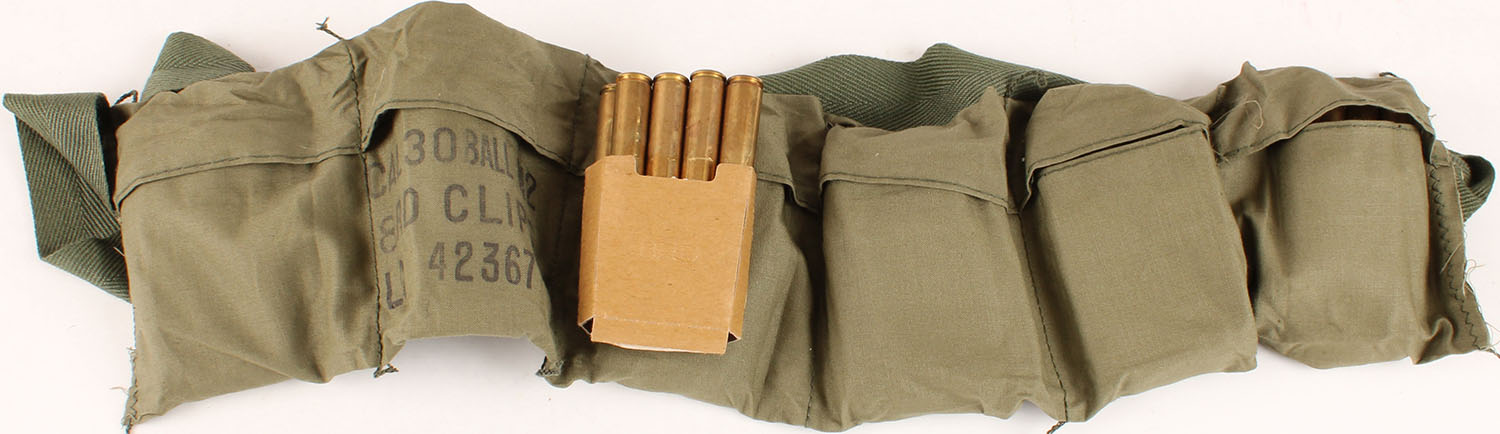 US, Lake City, 6 pouch Bandoleer, each pouch has 8 Rds. of 30-06 in cardboard holder not clips, Bandoleer is marked, ''CAL30BALL M2'', ''8RD CLIPS'', ''LC 42367'', dated 1967, ammo is very good. Grade: Excellent - Value: 40 to 80