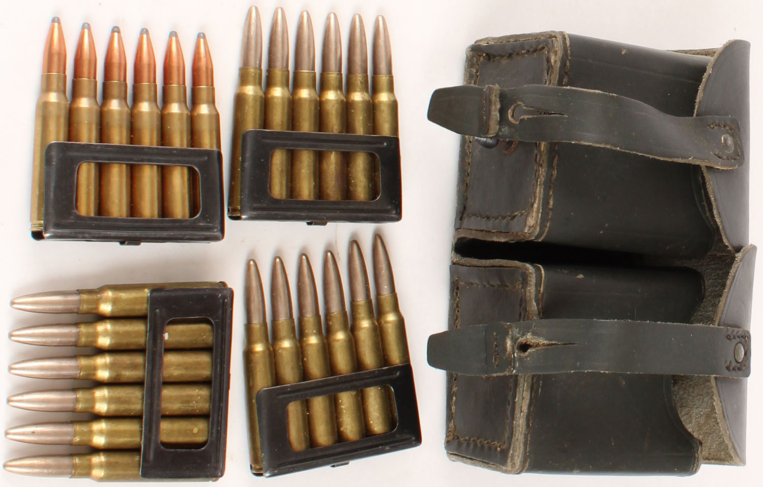 Italian, Carcano 2 cell ammo pouch full with 24 Rds. Of 7.35 x 51mm Carcano in clips with 4 extra empty clips, pouch is solid with light rub wear, faint stamp on bottom of pouch, ammo appears to be surplus, ammo is excellent. Grade: Excellent + - Value: 40 to 80