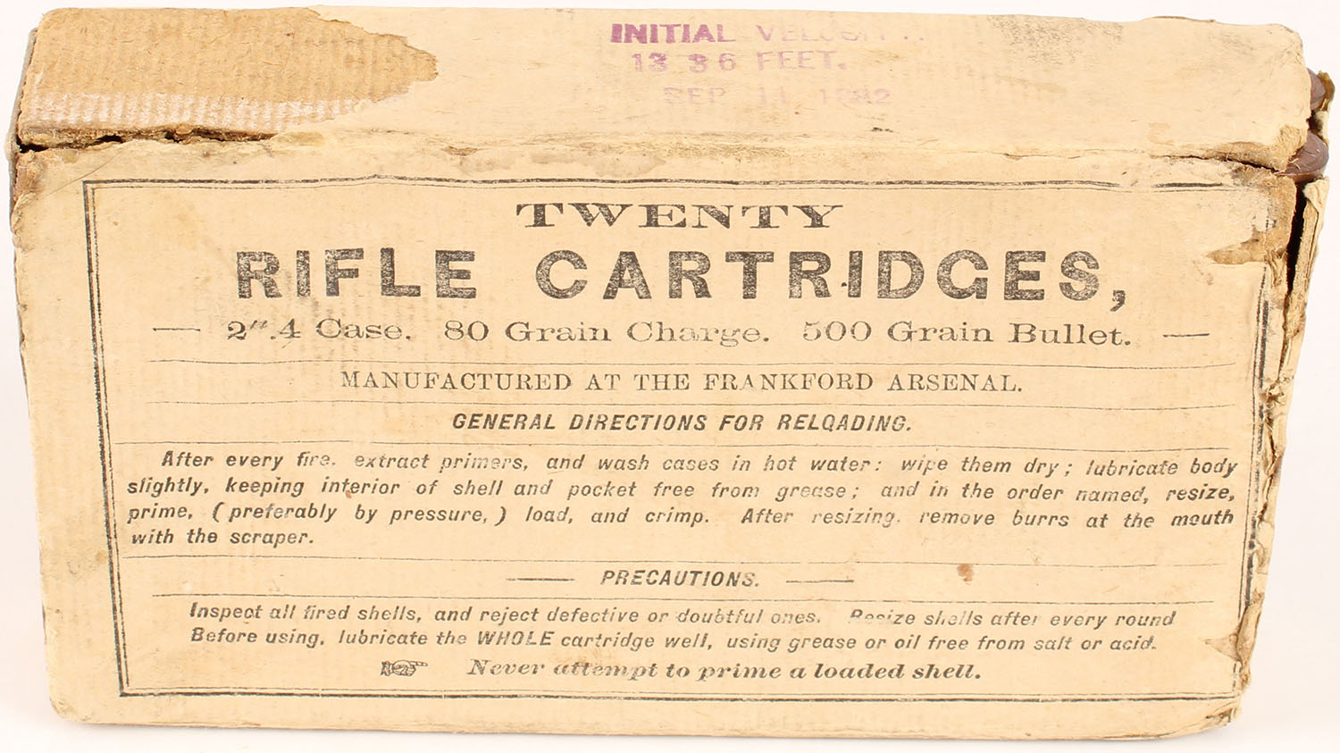 Frankford Arsenal, Rifle Cartridges (45-80), 80 Grs. Of powder, 500 Gr. Bullet,, top of box is stamped ''INITIAL VELOCITY'', ''1336 FEET.'', ''SEP 11 1882'', 1pc, Full, buff box & label with black print, box is weak with replaced left end piece, two partial split seams on right end, light age soiling, light rub marks, & edge wear, ammo is very good. Grade: Very Good - Value: 40 to 80