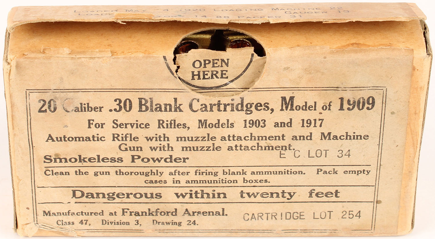 Frankford Arsenal, .30 Blank Cartridges, model of 1909, smokeless, Cartridge lot 254, dated 1920, 1pc, Full, buff box with gray label & black print, box is solid with rub marks, & light age soiling, ammo is very good. Grade: Very Good ++ - Value: 10 to 30