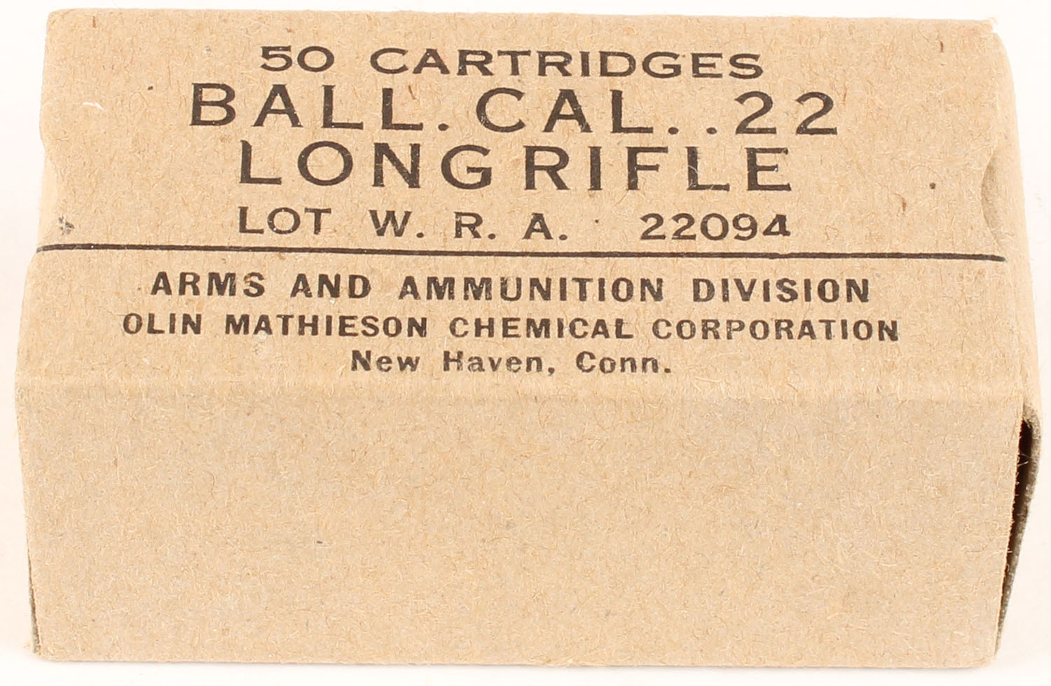 Olin, .22 LR Ball, Lot W.R.A. 22094, 1pc, Full, buff box with black print, box is solid with little to no wear, ammo is MINT. Grade: MINT - Value: 10 to 30