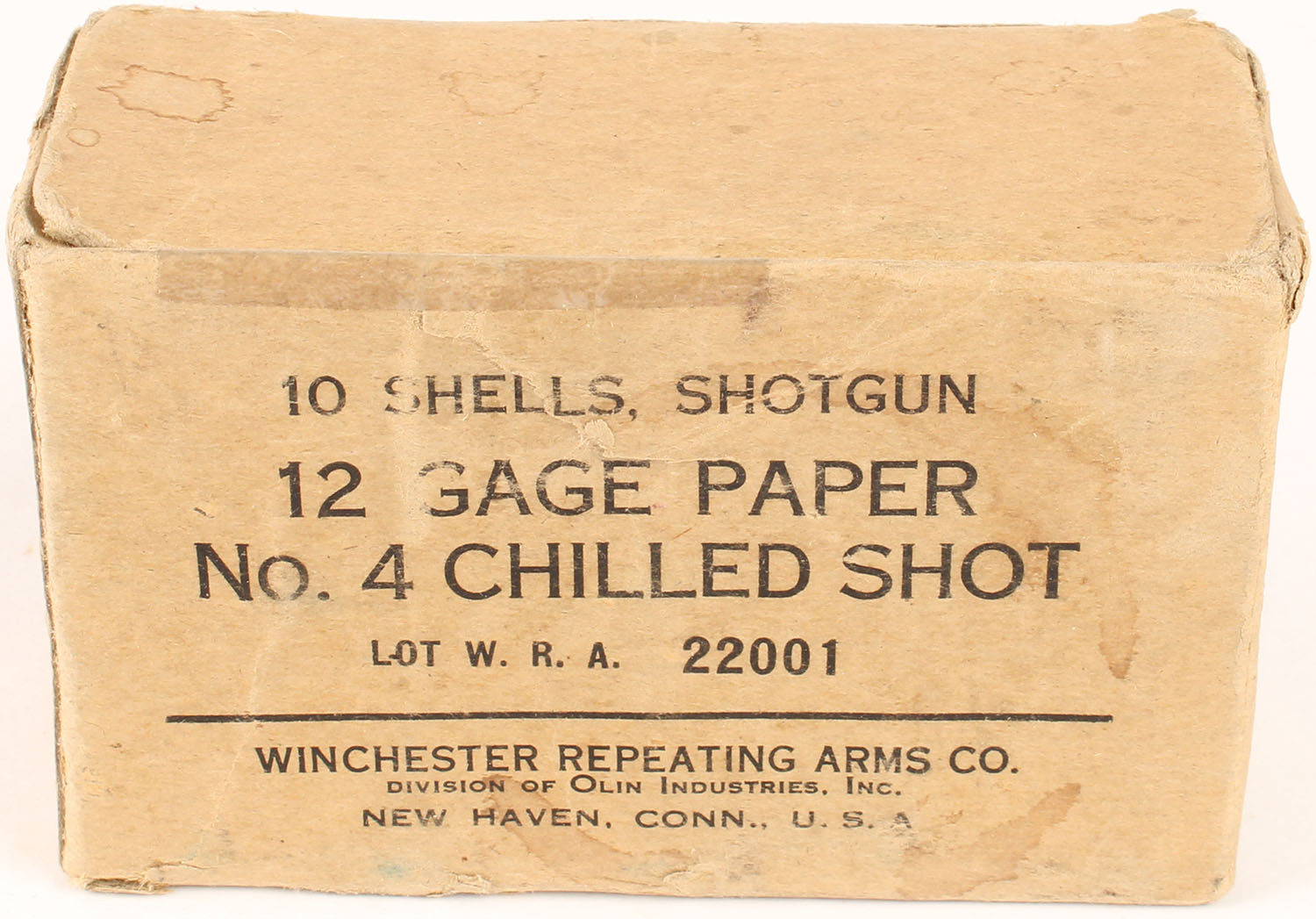 Winchester, 12 Ga., No.4 chilled shot, paper shells, Lot W.R.A. 22001, 1pc, Full, brown box with black print, box inside tape seam repairs on lid & both inside flaps, light age soiling/staining, handling wear, light rub marks, & edge/corner wear, ammo is very good. Grade: Very Good ++ - Value: 10 to 40