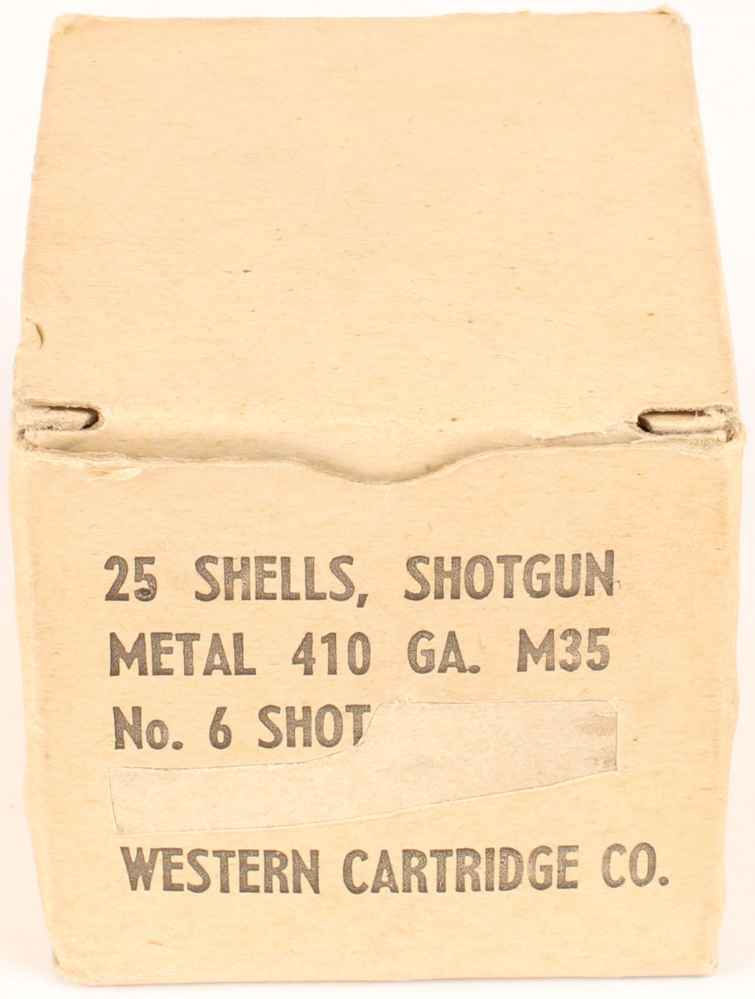 Western, 410 Ga., No. 6 shot, M35 Metal shotshells, 1pc, Full, buff box with black print, box is solid with lot stamp cut out, light rub marks & light handling wear, ammo is excellent. Grade: Excellent - Value: 20 to 40