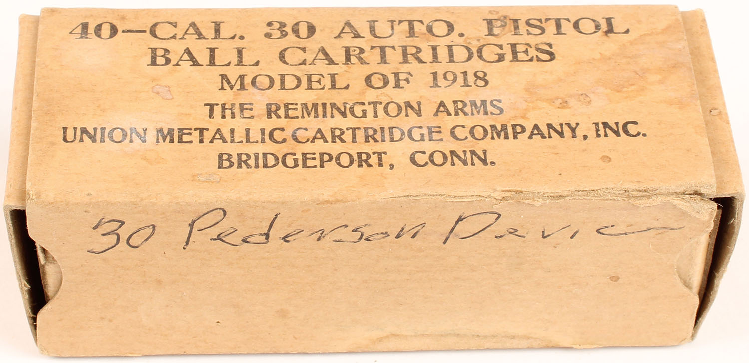 REM-UMC, .30 Auto Pistol Model of 1918, (Pederson device), Ball cartridges, 1pc, Partial 39 Rds., buff box with black print, box is solid with pen marks, stains, partial seam split, & light rub marks, ammo is very good. Grade: Very Good ++ - Value: 40 to 80