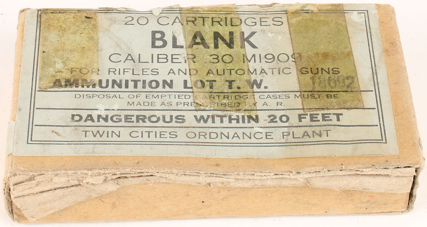 Twin cities, .30 M1909 Blanks, Lot T.W. 18692, 1pc, Full, buff box with blue label & black print, box has multiple split seams, tape, rub marks, & edge wear, ammo is very good. Grade: Good ++ - Value: 10 to 30