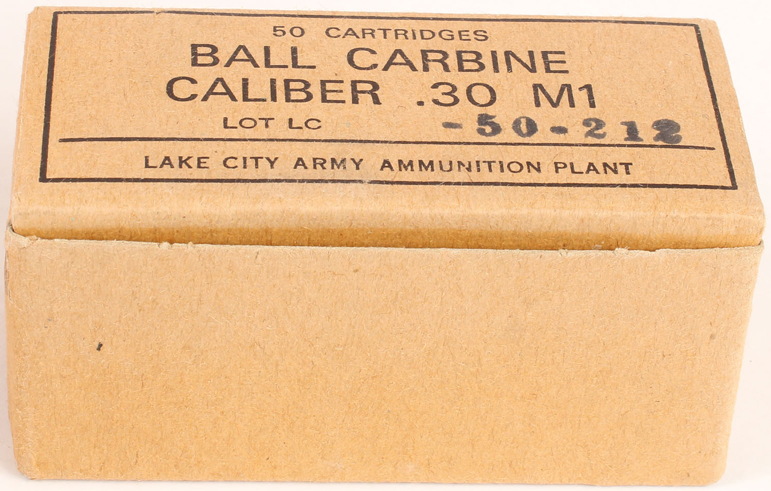 Lake City, .30 M1 Carbine Ball, Lot LC -50-212, 1pc, Full, brown box with black print, box is solid with light wear, ammo is excellent. Grade: Excellent ++ - Value: 30 to 60