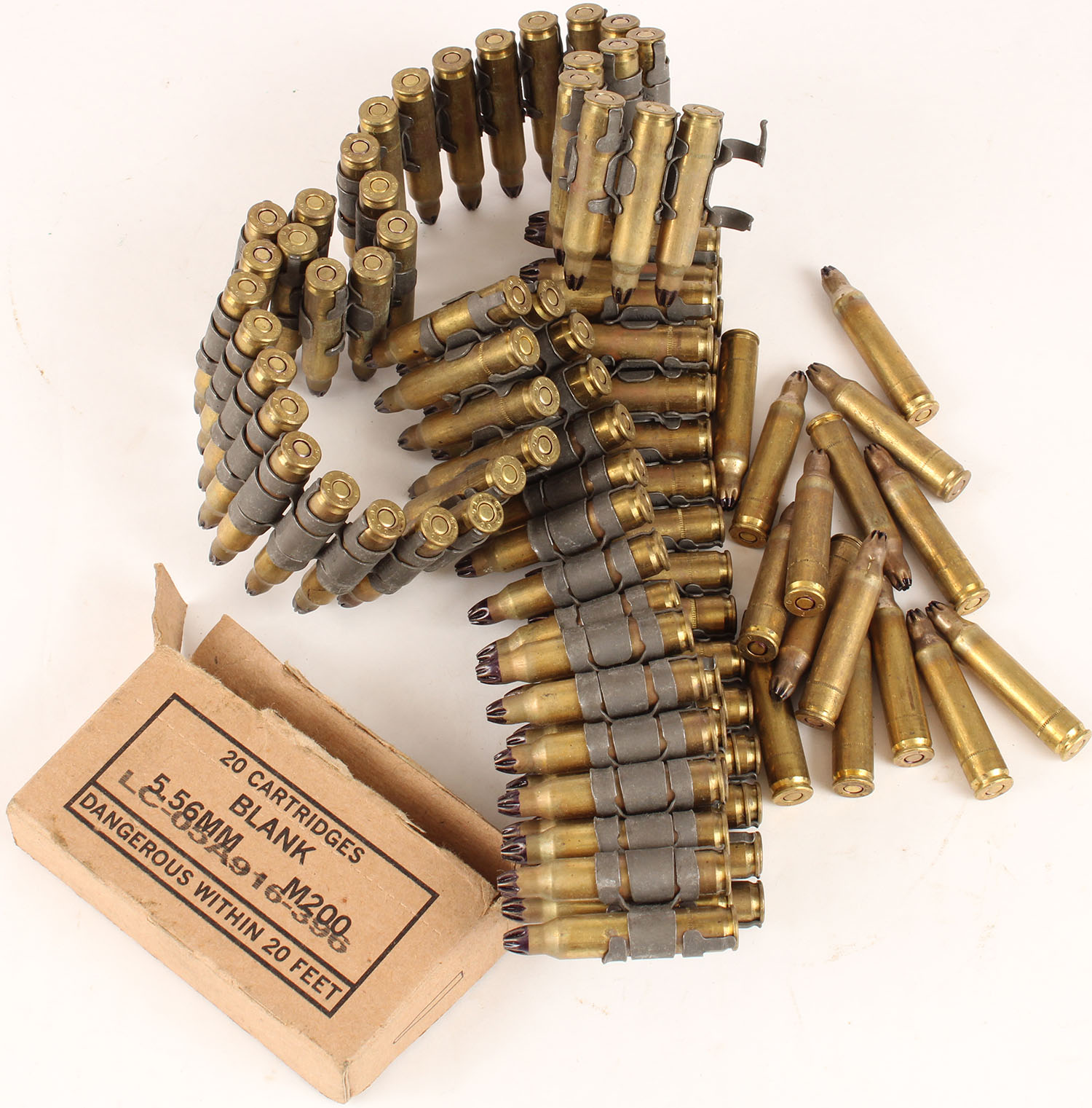 Large lot of Approx. 120 Rds. Of Lake City 5.56 blanks, some linked some loose, ammo dated 2004, ammo is excellent. Grade: Excellent - Value: 20 to 100