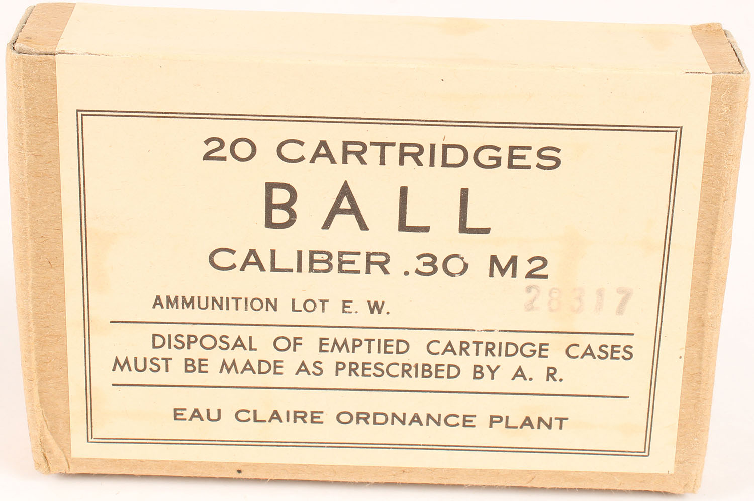 EAU Claire. .30 M2 Ball, Lot E.W. 28317, 1pc, FULL & SEALED, buff box & label with black print, box is solid with light age soiling, light wear on bottom from bullets, & light rub marks. Grade: Excellent - Value: 20 to 40