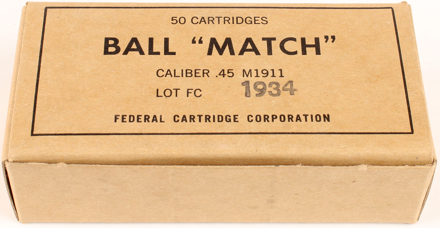 Federal, .45 M1911 Ball Match, Lot FC 1934, 1pc, Full, brown box with black print, box is solid with little to no wear, ammo is MINT. Grade: MINT - Value: 30 to 60