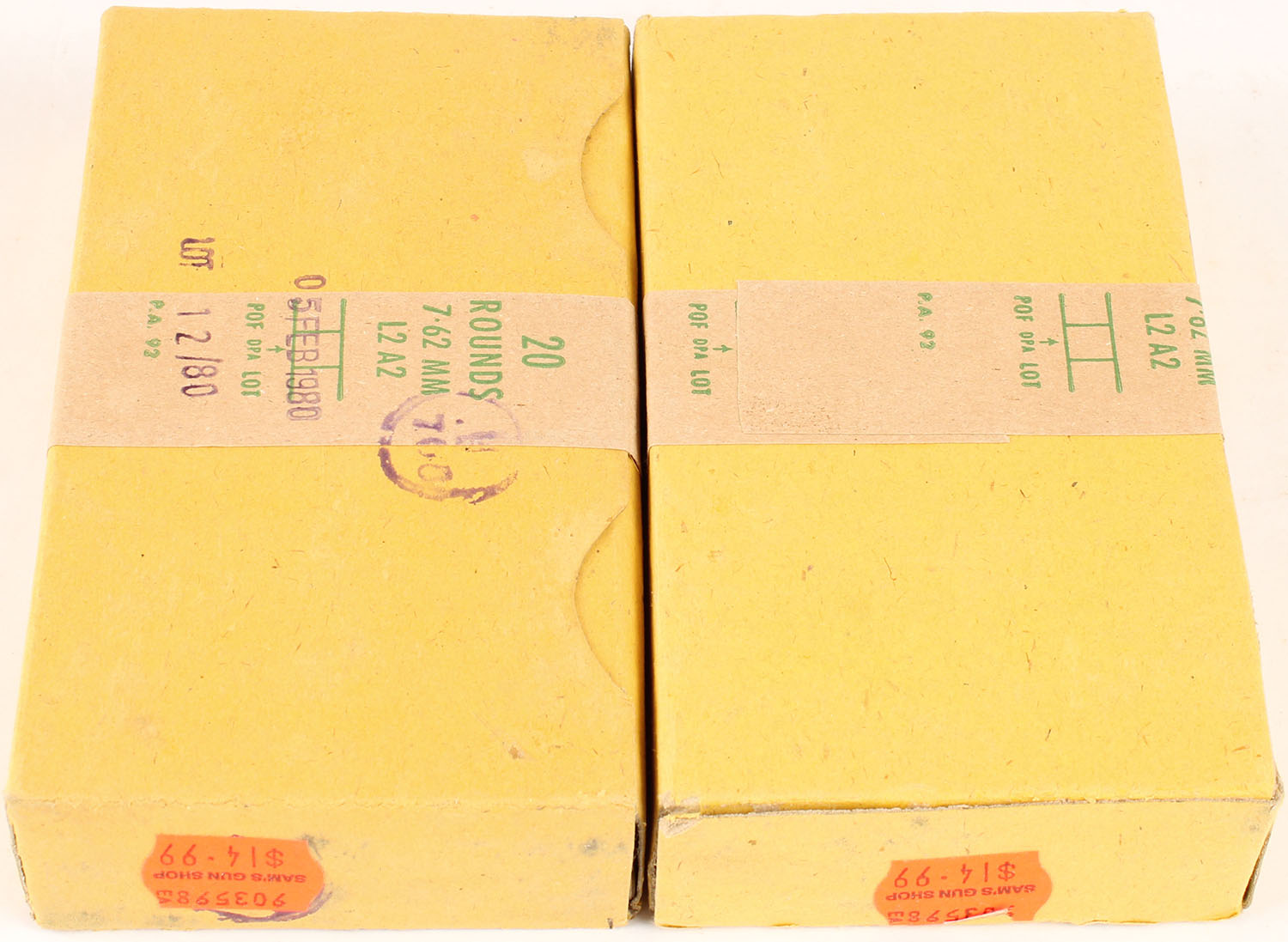 Lot of two, POF (Pakistan Ordnance Factories), 7.62mm L2 A2, 1980 dated, 1pc, Both SEALED, yellow box with buff label & green print, box's are solid with light rub wear, ammo is very good. Grade: Excellent - Value: 30 to 60