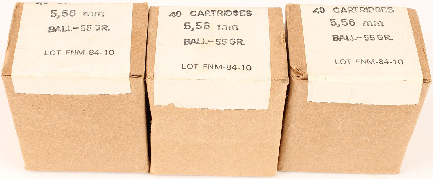 Lot of three, Portuguese, 5.56mm Ball, 55 Gr., 1984 dated, 1pc, Full, brown box with white label & black print, boxes are solid with light rub wear, ammo is excellent. Grade: Excellent - Value: 40 to 100
