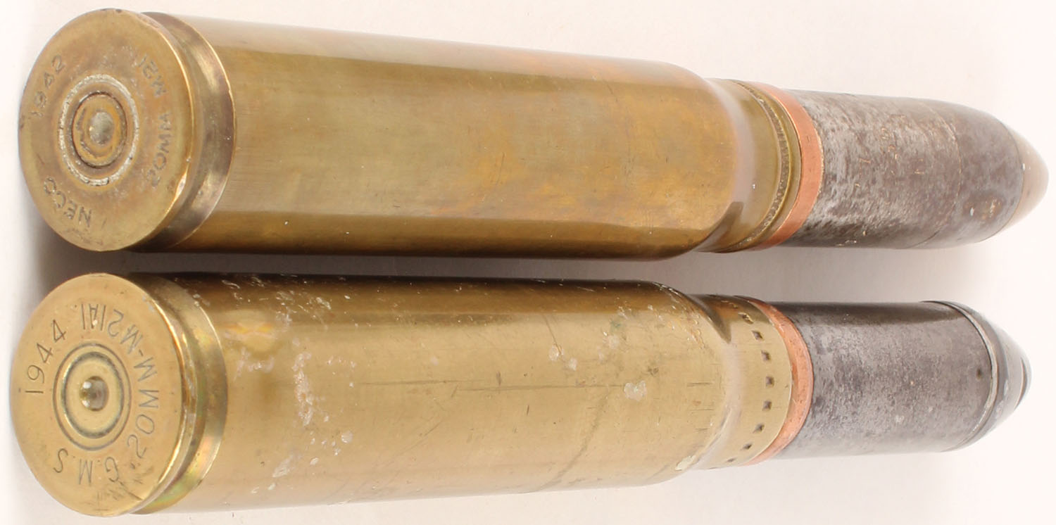 Lot of two 20mm Rds., one is a M21 other is a m21A1 both for the Hispano auto cannon, both have dented primers. Grade: Excellent - Value: 10 to 40