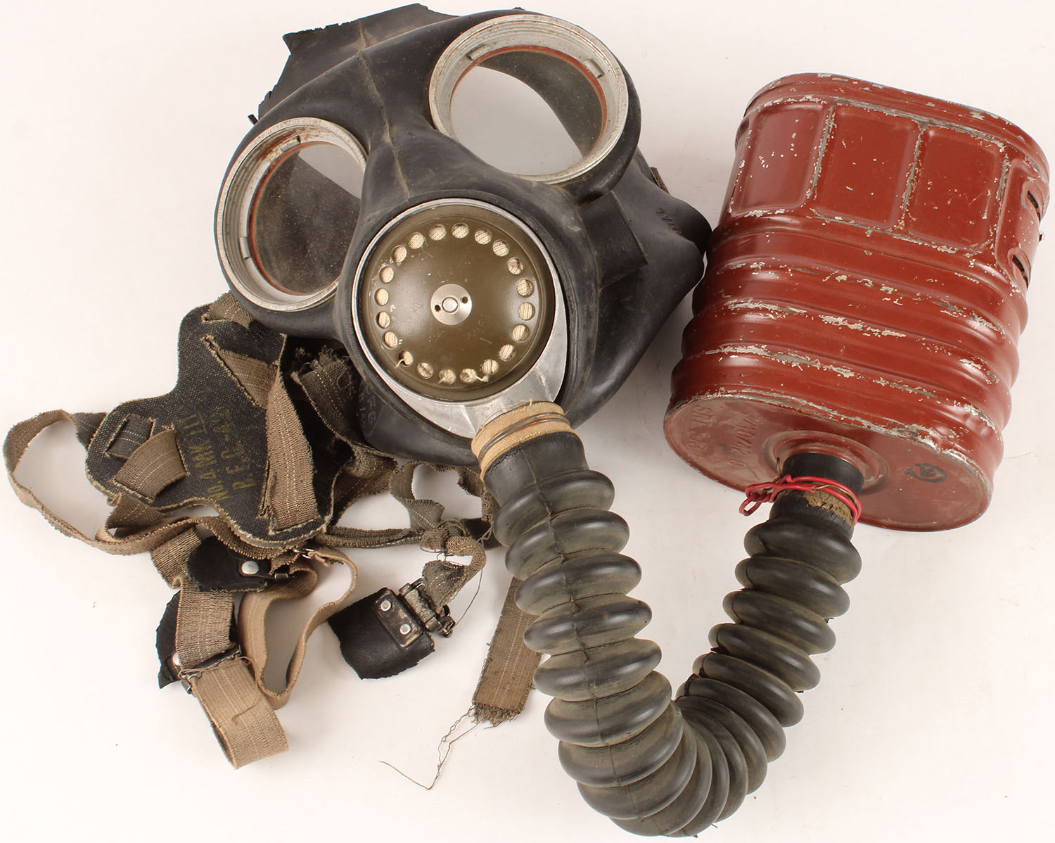 British, WW2 Mark 4 gasmask, Filter has asbestos inside, has tears in rubber & some straps have been torn off. Grade: Good ++ - Value: 20 to 100