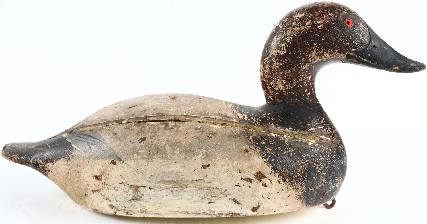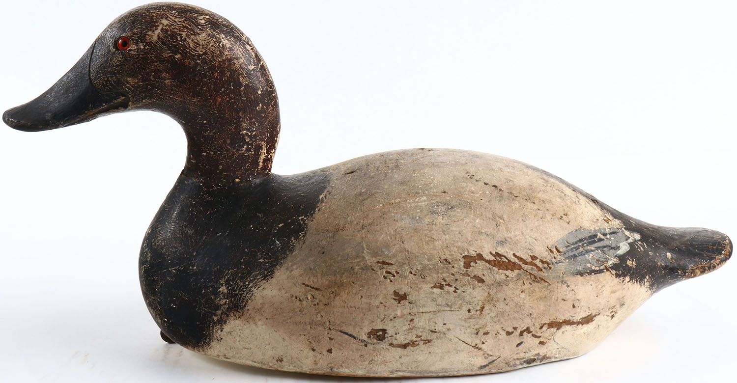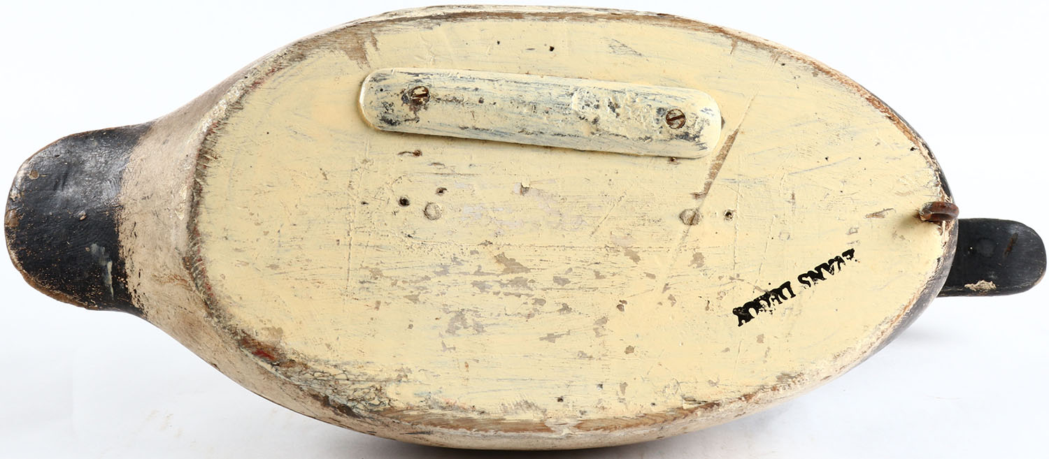 Canvasback Drake by Evens Decoy Co., Mammoth grade, stamped on bottom, GE, original paint shows wear, solid wood, has glue repair to age crack, not sure why, structurally excellent. Grade: Very Good + - Value: 100 to 300