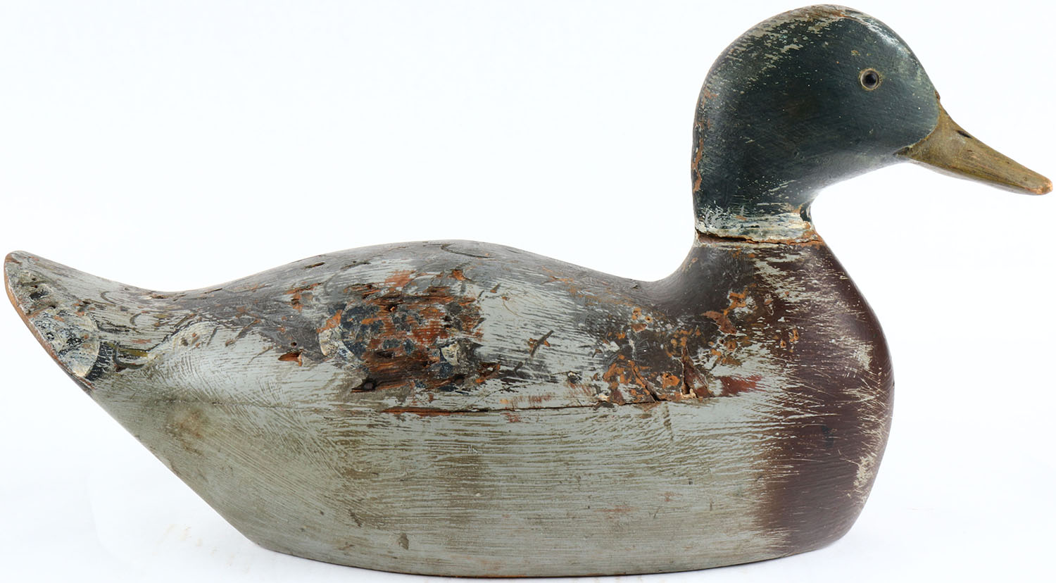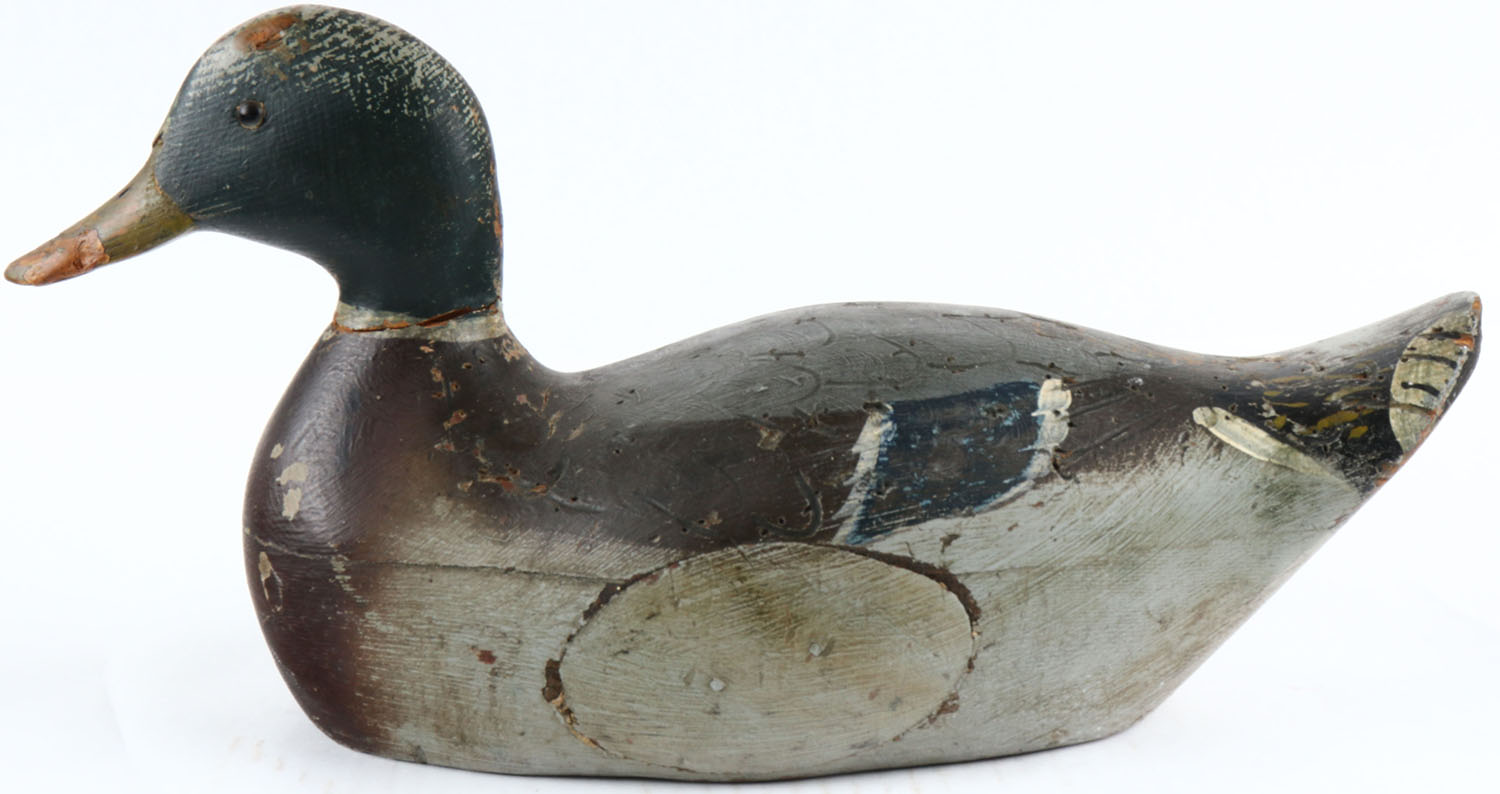 Mallard Drake by Wm E. Pratt Decoy Company, Early Hollow wood, #3 feathering was carved into the back prior to hand painting, original paint shows some wear,, neck is solid but has crack around base,, Ref. Decoy Mag. Nov/Dec 2000. Grade: Very Good ++ - Value: 100 to 300
