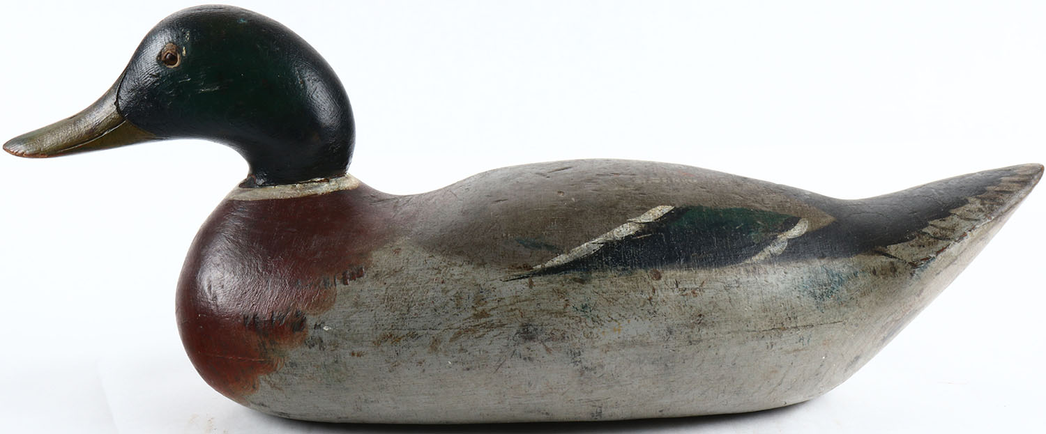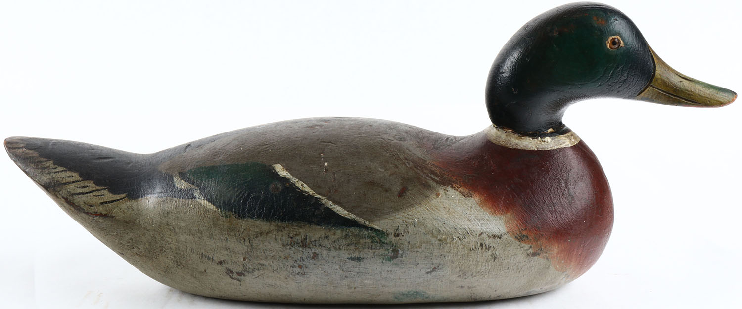 Mallard Drake by Mason Decoy Company, Detroit, MI, 1896-1924 challenge grade, glass eyes, solid wood, orginal paint, has small age crack on belly otherwise structurally excellent. Grade: Excellent - Value: 150 to 300