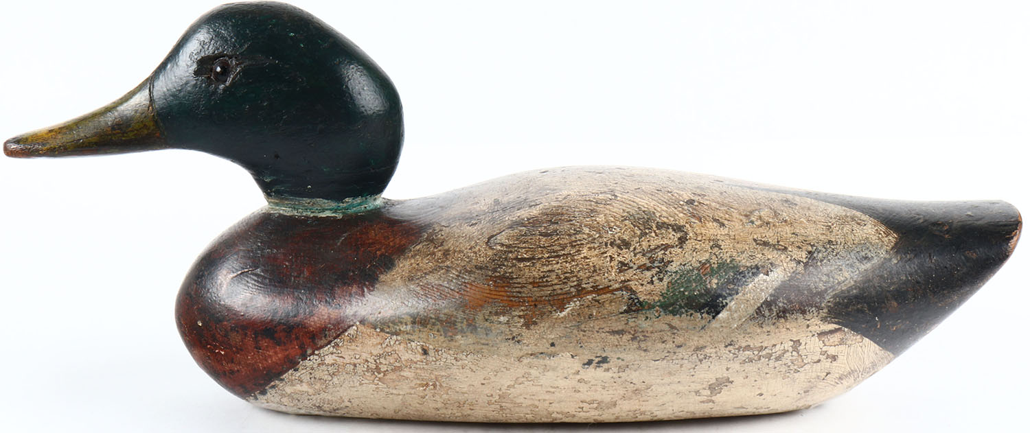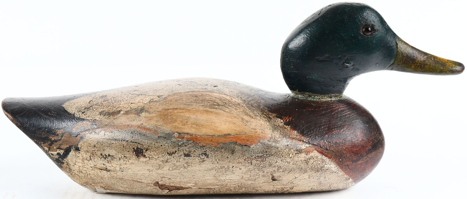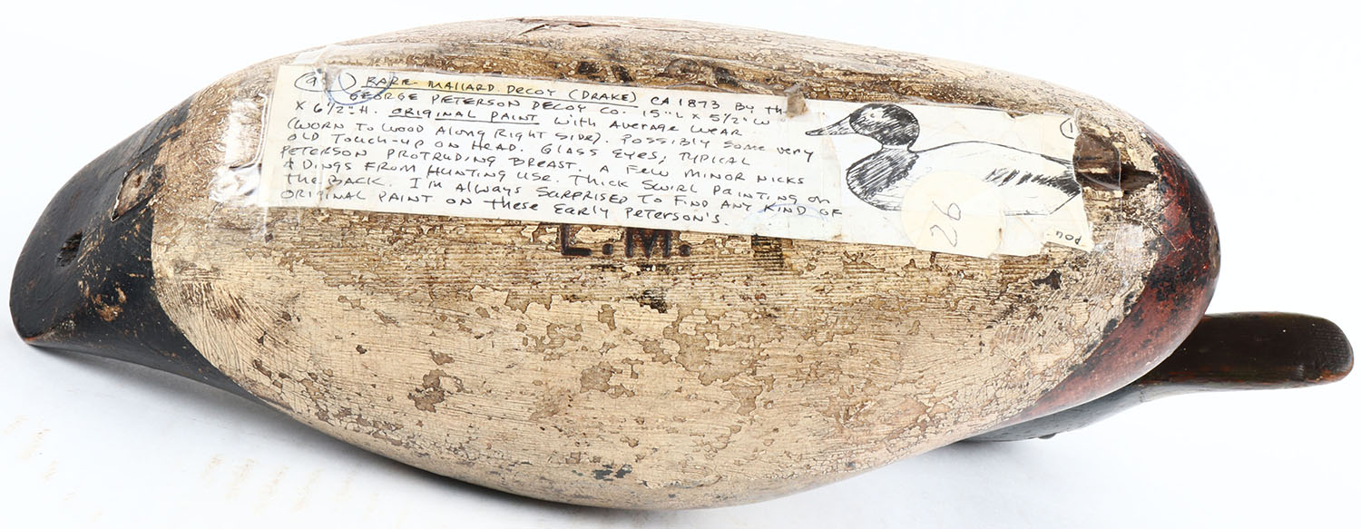 Rare Mallard Drake by George Peterson Decoy Co., 1873, glass eyes, solid wood, original paint shows wear with some old touchup on head, typical Peterson protruding breast, a few minor nicks & dings form hunting use, thick swirl paint on the back. Grade: Very Good ++ - Value: 100 to 500