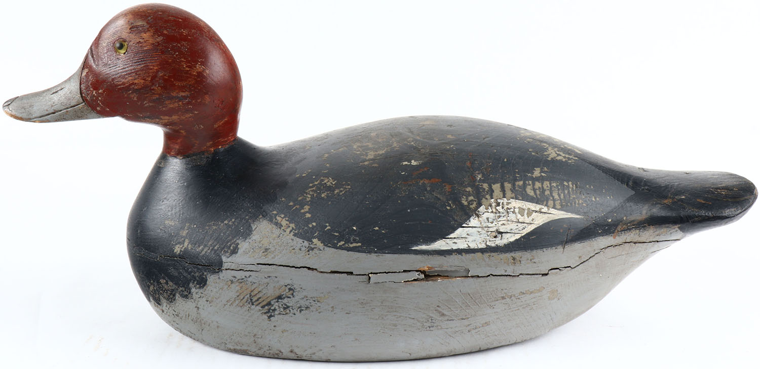 Over Sized Redhead darke by Mason Decoy Company, Detroit, MI, 1896-1924 premier grade, glass eyes, solid wood, original paint, has age crack around middle of body where the two pieces of wood come together. Grade: Very Good ++ - Value: 100 to 500