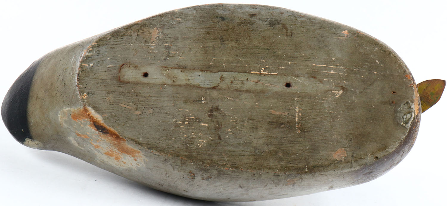 Mallard drake by Pratt Decoy Co., glass eyes, hollow body, original paint shows swirl pattern on back, some wear to top of head & right side of body, structurally excellent. Grade: Excellent - Value: 100 to 300