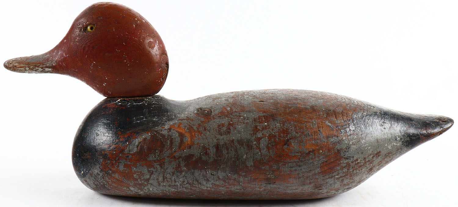 Redhead Drake made by Mason Decoy Co., 1896-1924, Standard Grade, glass eyes (one missing), solid wood, original paint shows wear. Grade: Very Good - Value: 60 to 150
