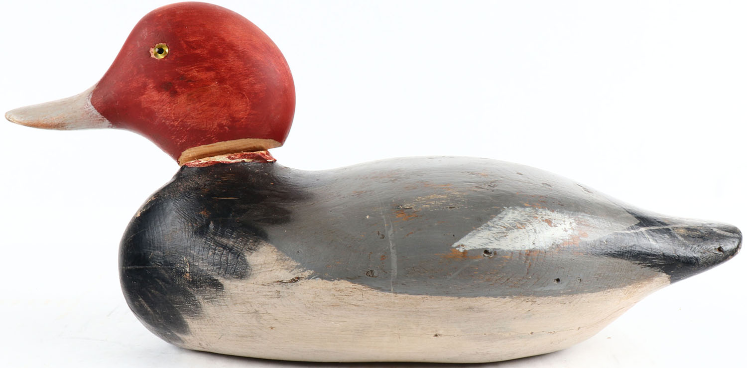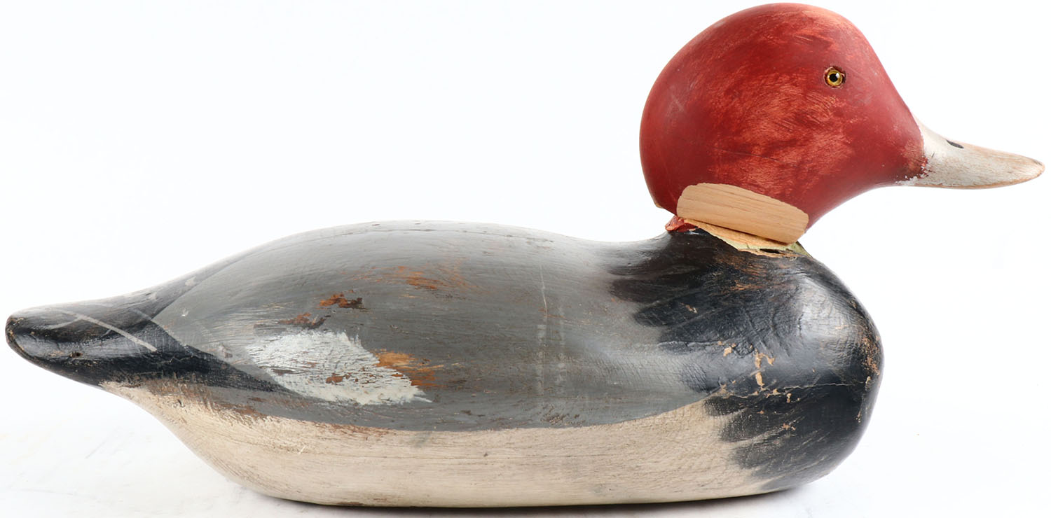 Redhead Drake made by Mason Decoy Co., 1896-1924, Standard Grade, glass eyes, solid wood, original paint on body & head has been replaced & is loose. Grade: Very Good - Value: 20 to 100