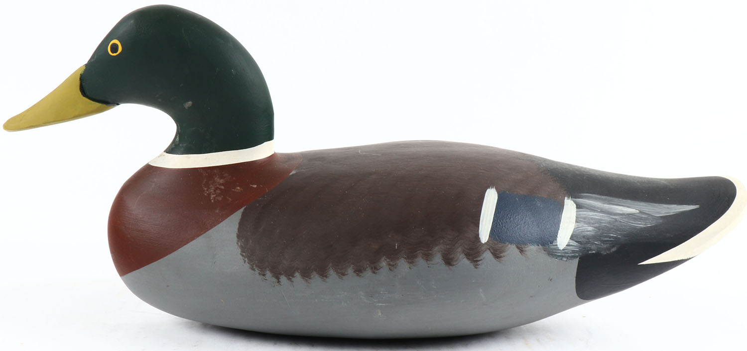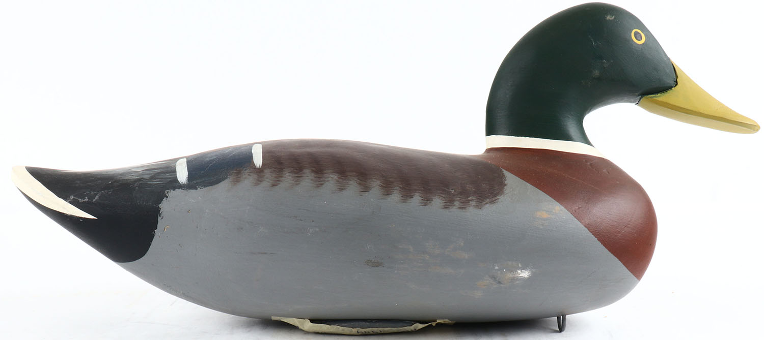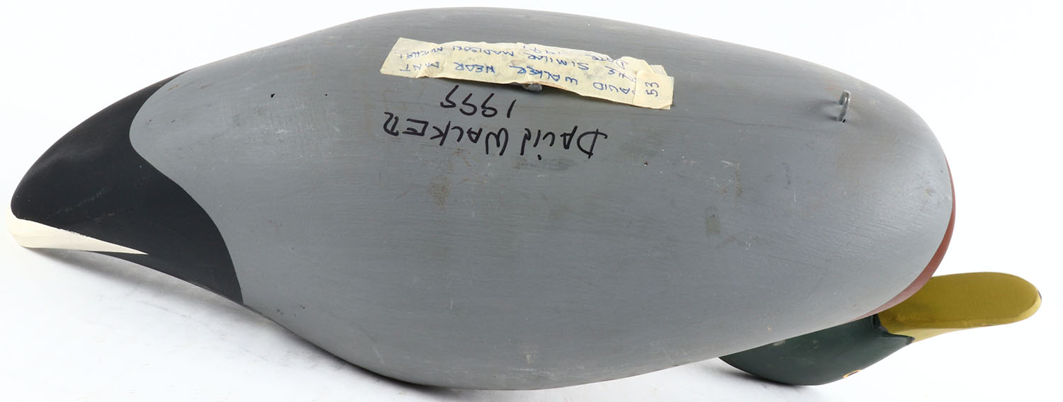 Mallard Drake by Dave Walker Havre de Grace, MD, solid wood, painted eyes, near mint original paint, structurally excellent, bottom is signed. Grade: Excellent ++ - Value: 50 to 150