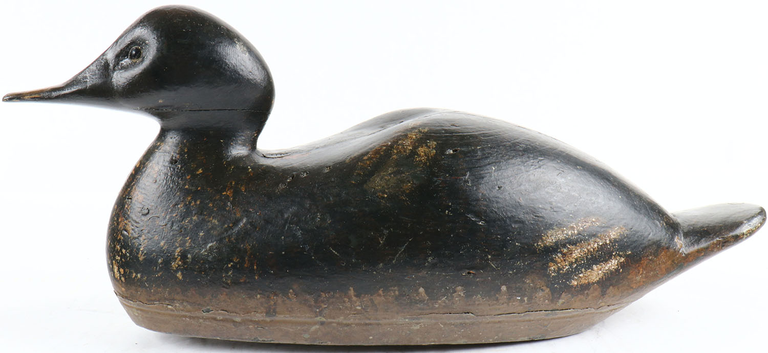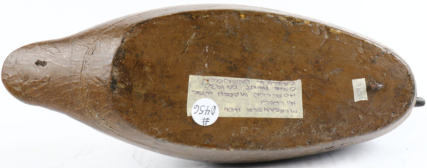 Merganser hen by unknown carver, found Horicon Marsh WI, glass eyes, original paint, hollow wood, structurally excellent. Grade: Excellent - Value: 50 to 250