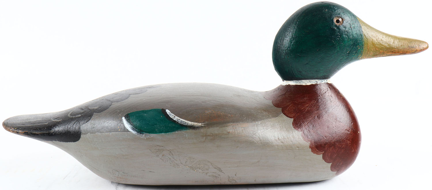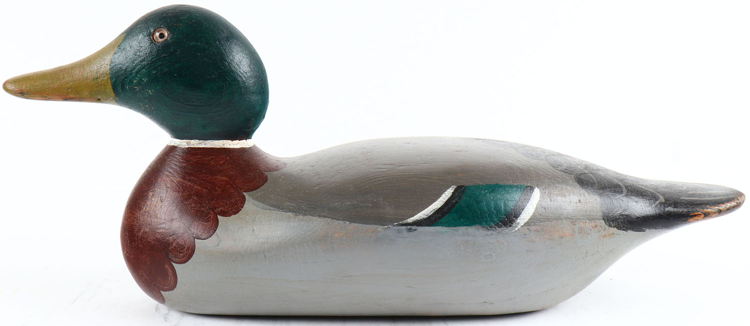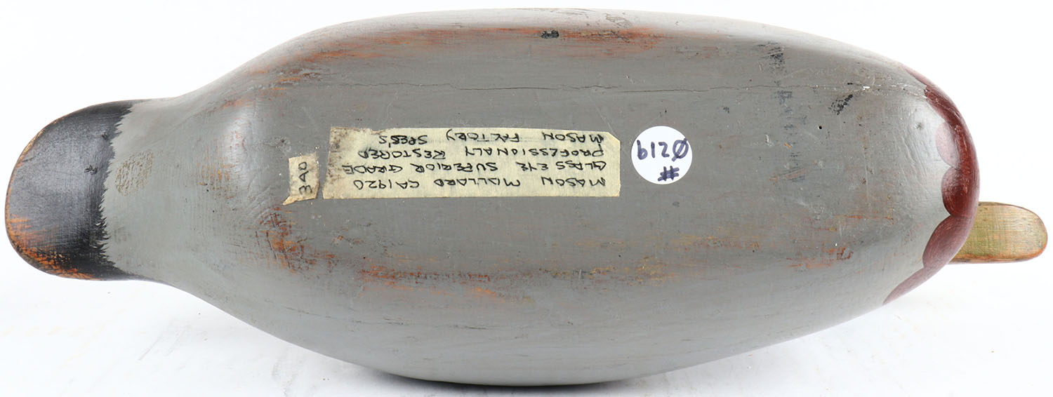 Mallard Drake made by Mason Decoy Co., 1896-1924, Superior Grade, glass eyes, solid wood, professionally restored, structurally excellent. Grade: Excellent ++ - Value: 80 to 250