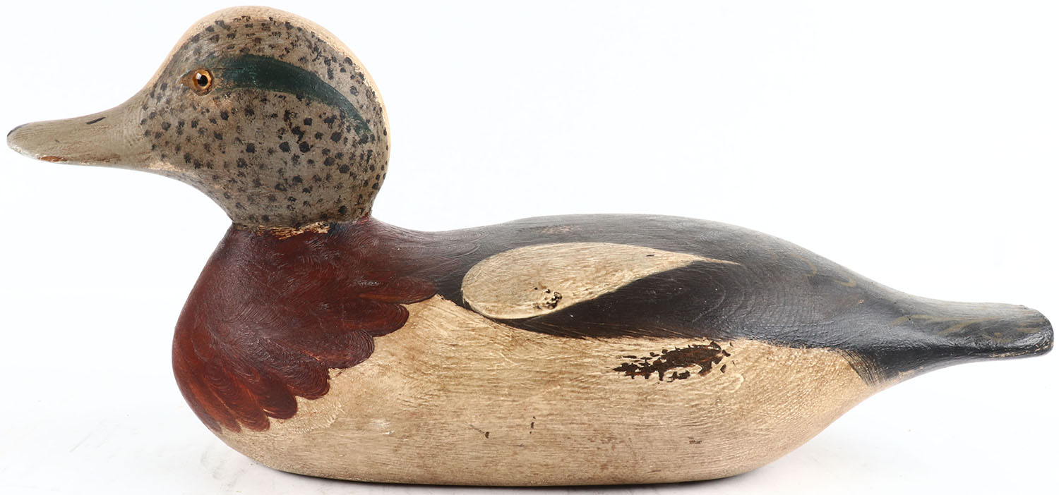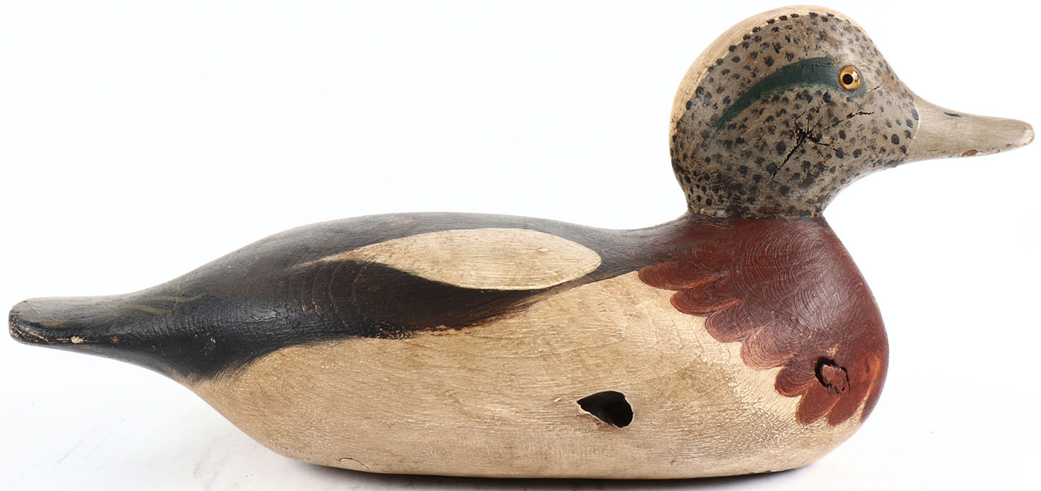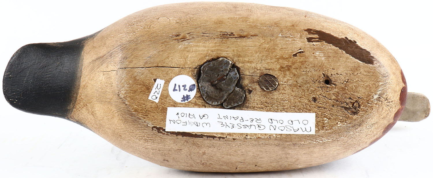 Widgeon Drake made by Mason Decoy Co., 1896-1924, Standard Grade, glass eyes, solid wood, old repaint, solid wood, structurally excellent. Grade: Excellent - Value: 80 to 250
