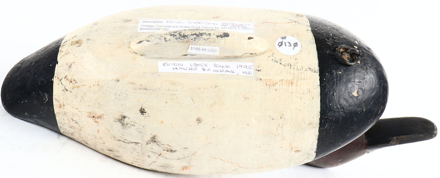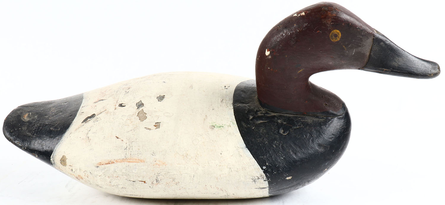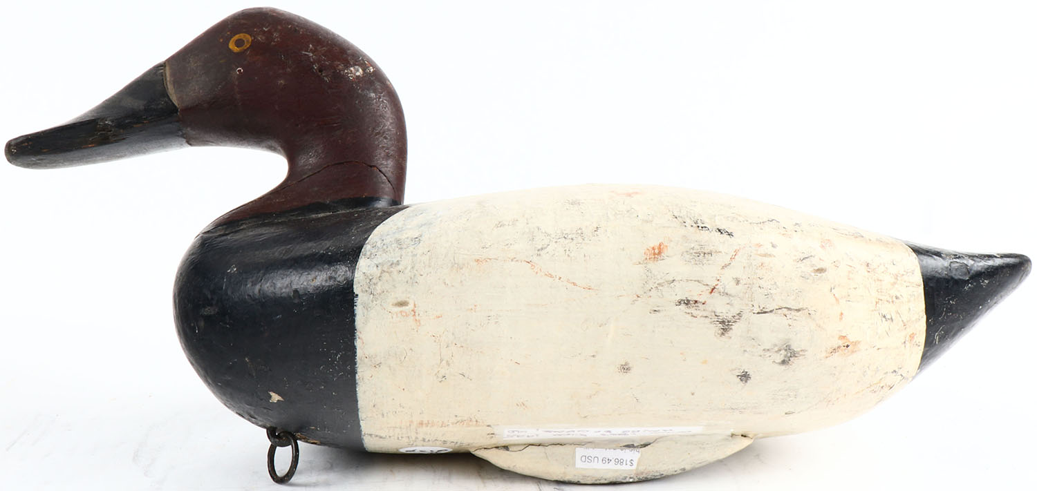 Canvasback Drake by Jm Holly, circa 1900's, PE, solid wood, old repaint, neck has a crack. Graded: Very Good ++ - Value: 80 to 200