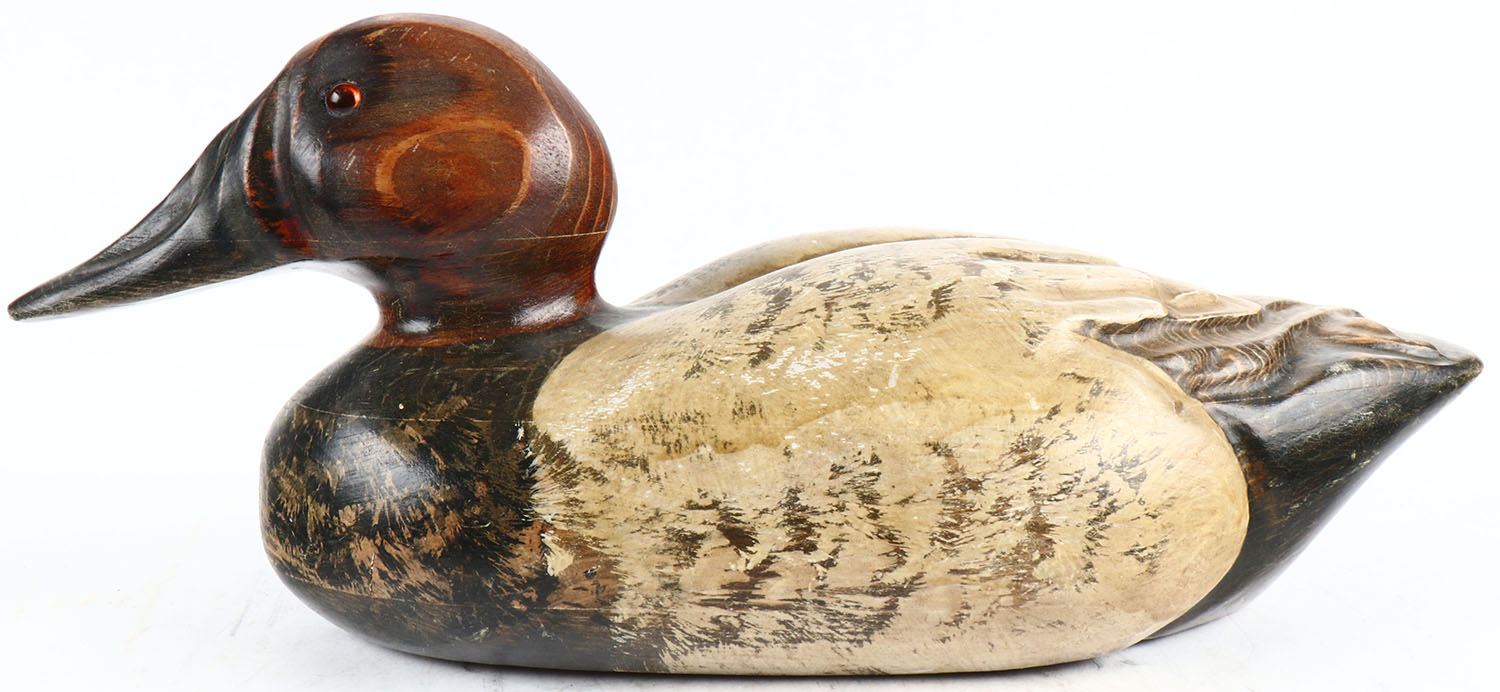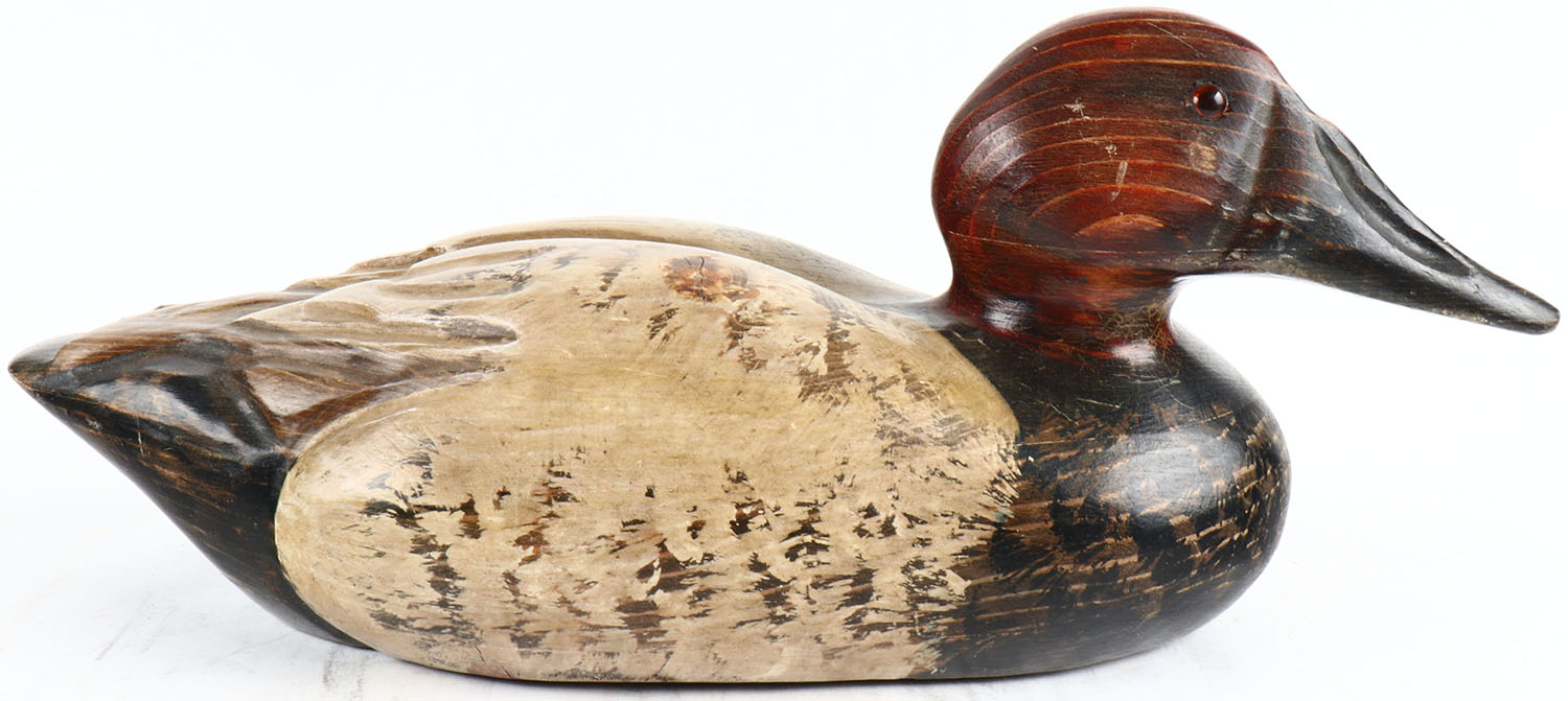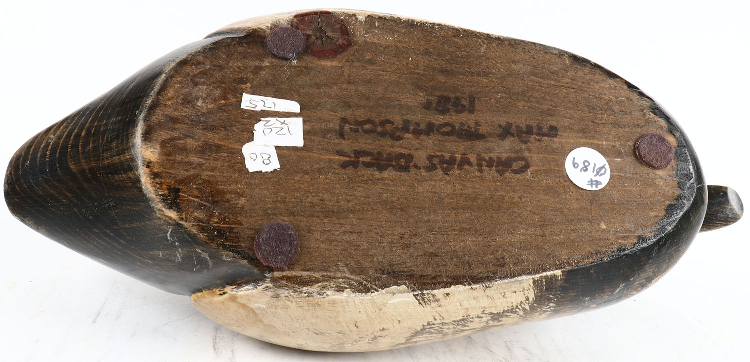Canvasback Drake by Max Thompson, glass eyes, solid wood, original paint, signed on bottom, structurally excellent. Grade: Excellent + - Value: 20 to 100
