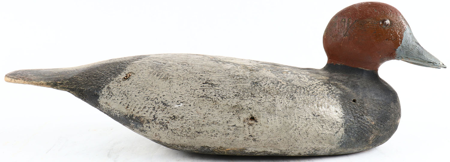Redhead Drake by unknown maker, tack eyes, solid wood, original paint, bill is chipped on the end. Grade: Very Good ++ - Value: 20 to 100