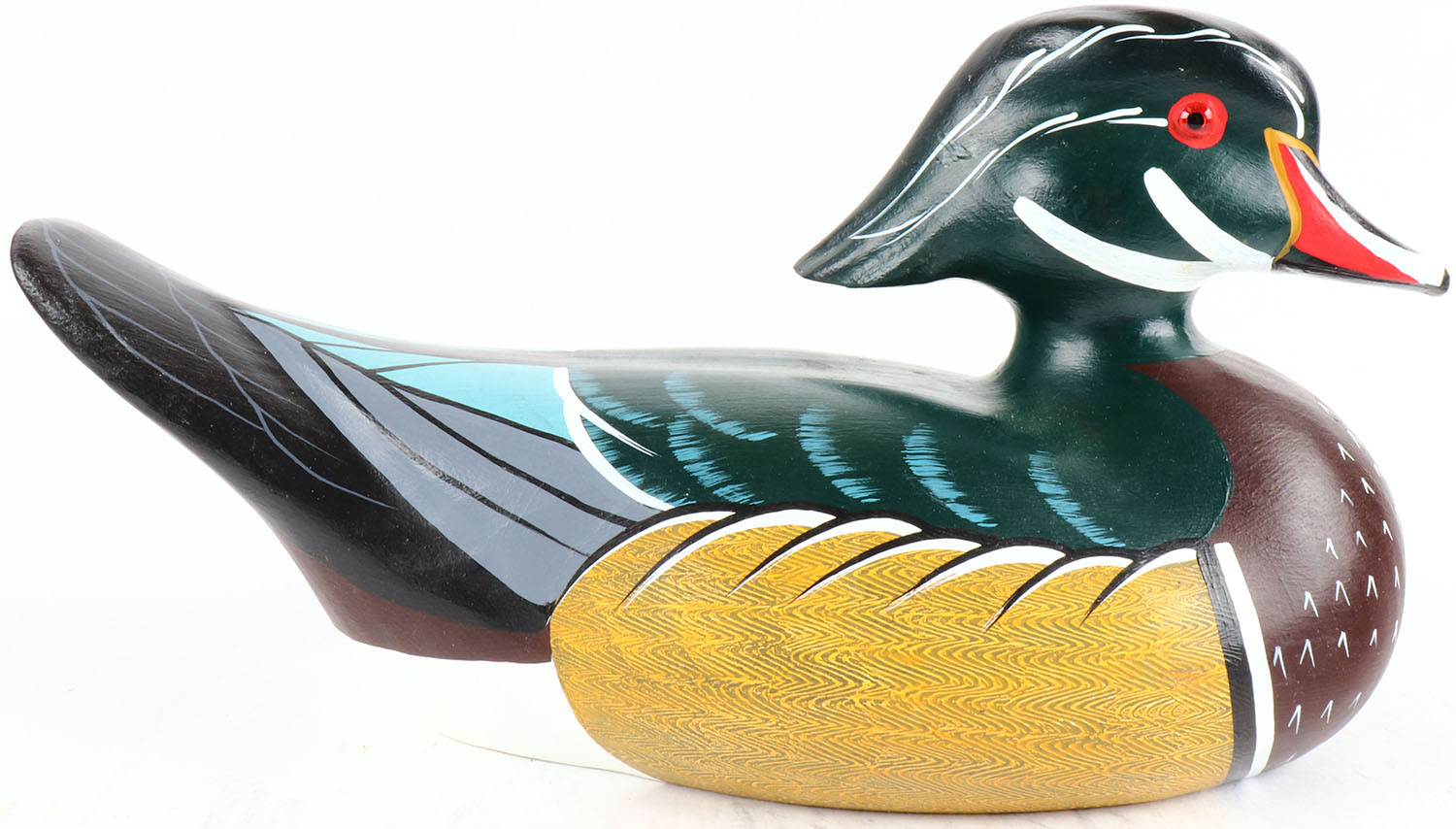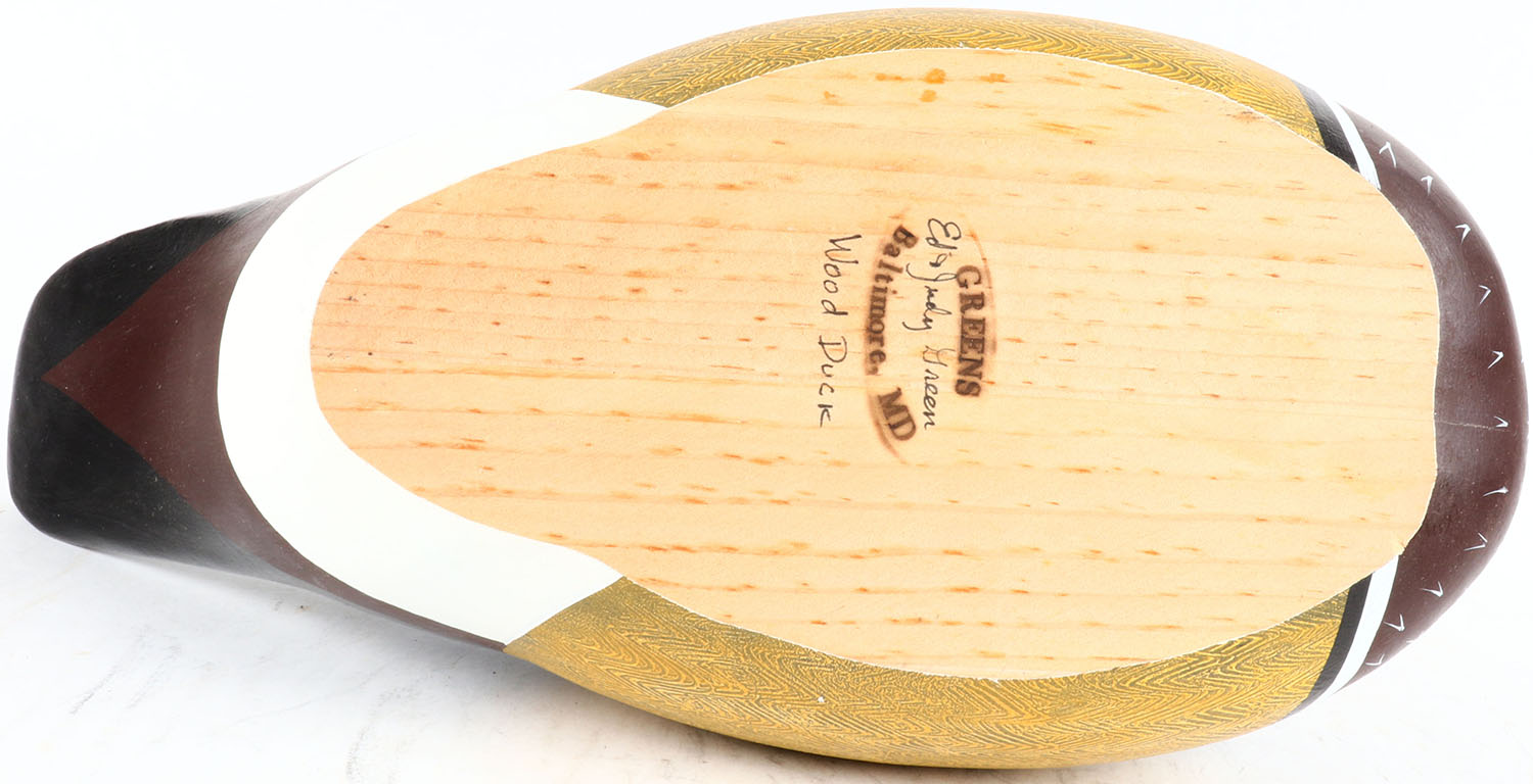Woodduck Drake by Ed and Judy Green, Baltimore MD, glass eyes, solid wood, beautiful original paint with comb painting, structurally excellent, signed and branded on bottom. Grade: MINT - Value: 30 to 100