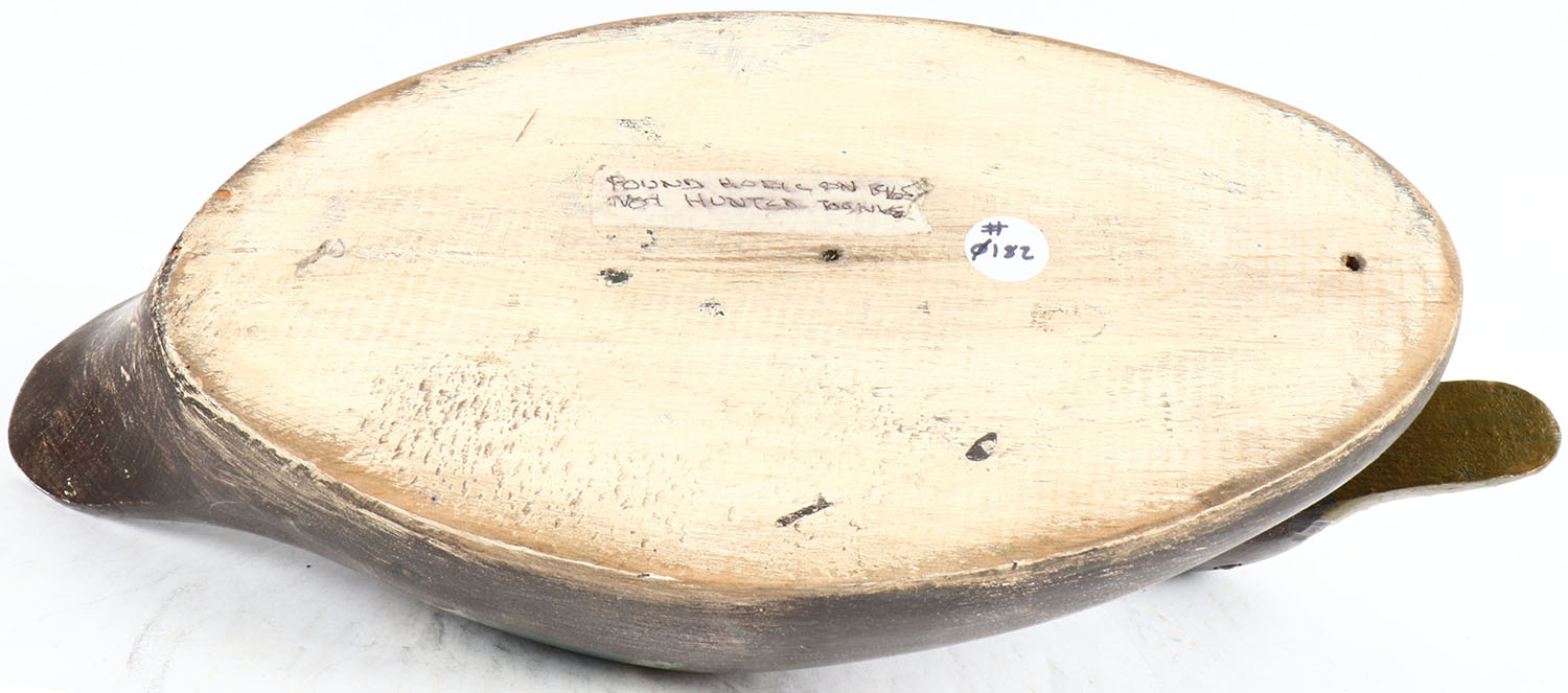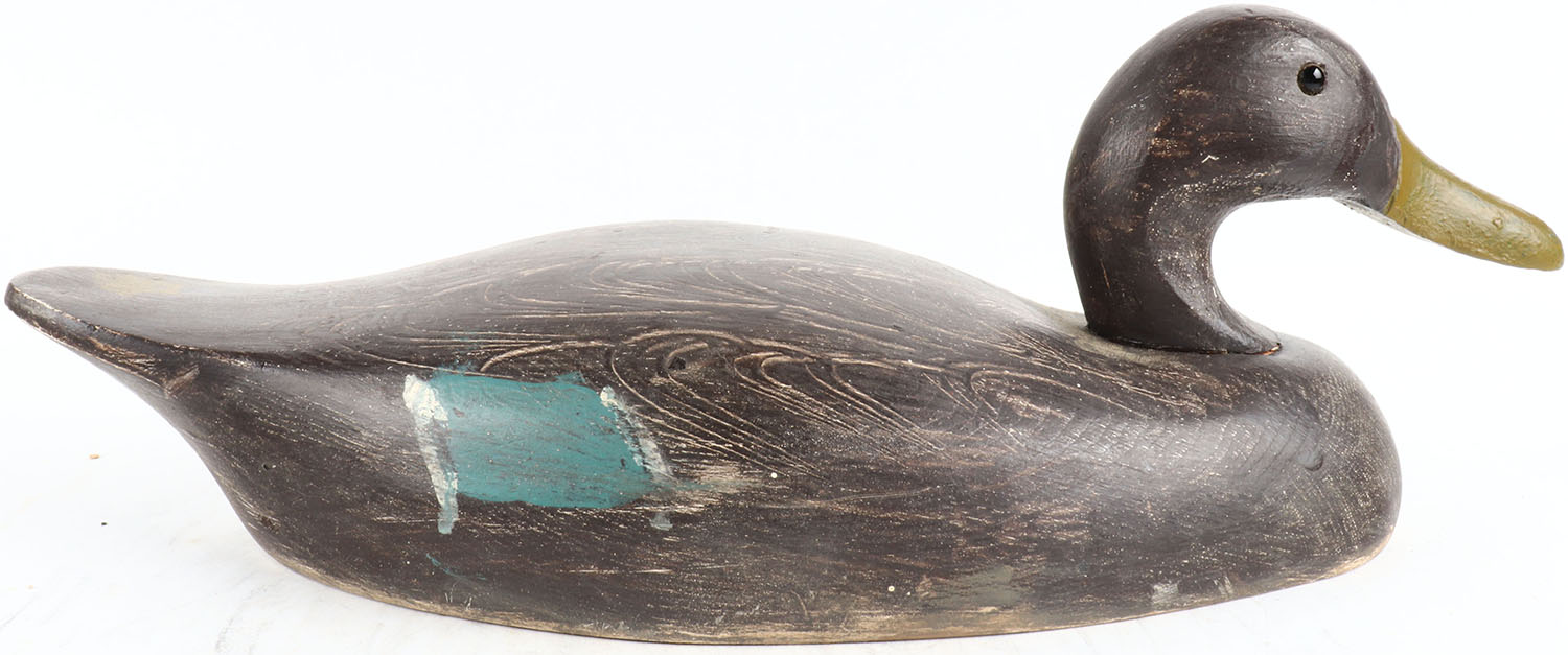 Black Duck by unknown maker, glass eyes, solid wood, original paint, head has been glued back on. Grade: Very Good + - Value: 20 to 60