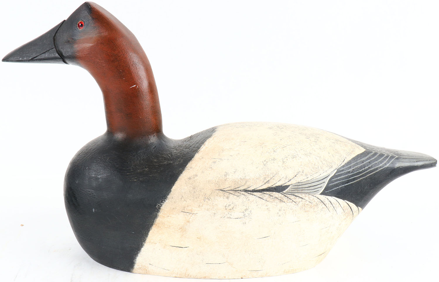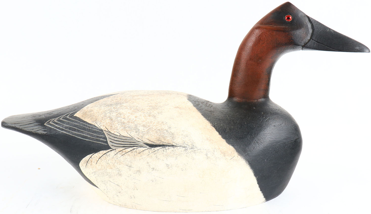 Canvasback Drake by Porters Handcrafted Decoys, George Porter, glass eyes, hollow wood, structurally excellent, signed on bottom, original paint. Grade: Excellent + - Value: 30 to 200