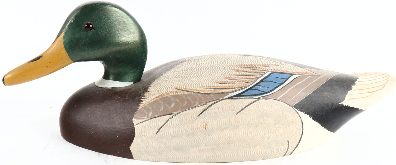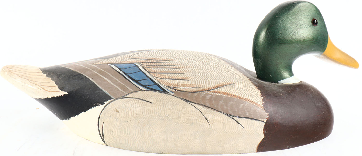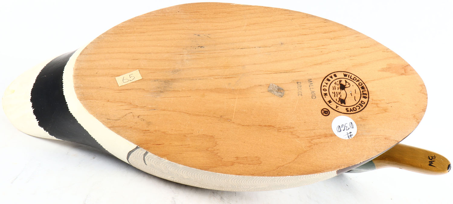 Mallard Drake by Wildfowler Decoys Babylon, N.Y. glass eyes, solid wood, structurally excellent, branded by WILDFOWLER DECOYS on bottom, original paint with comb painting. Grade: MINT - Value: 30 to 150