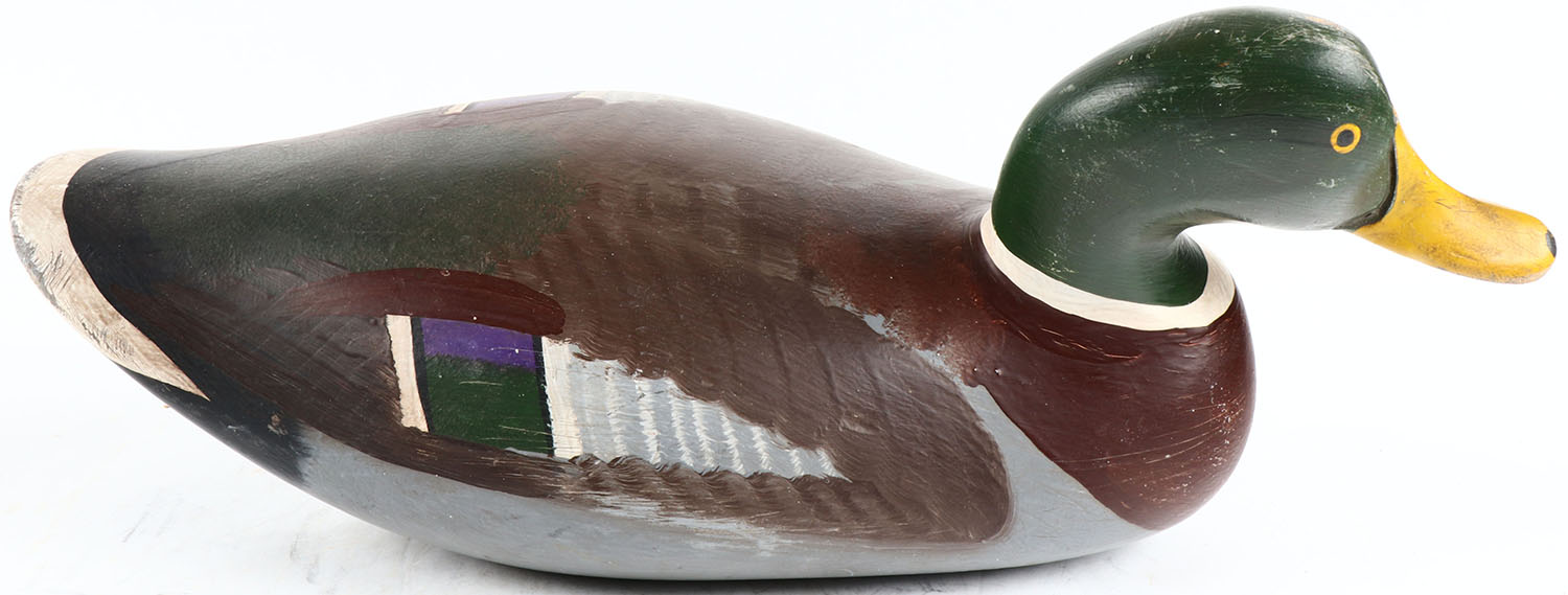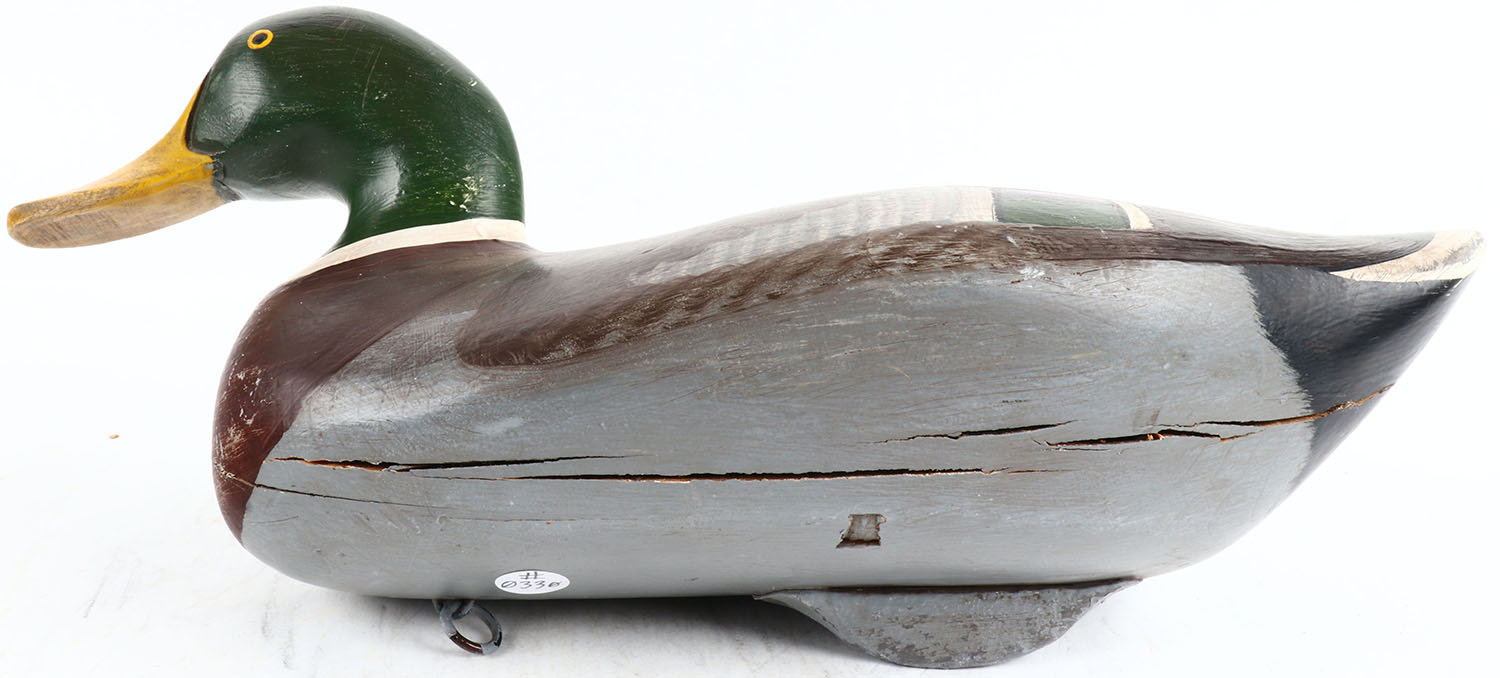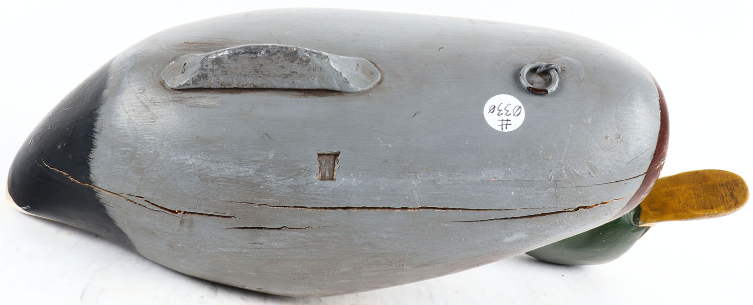 Mallard Drake by Harry Jobes, Harve De Grace, MD. painted eyes, solid wood, has age cracks on bottom, signed on bottom, repainted. Grade: Very Good ++ - Value: 30 to 150