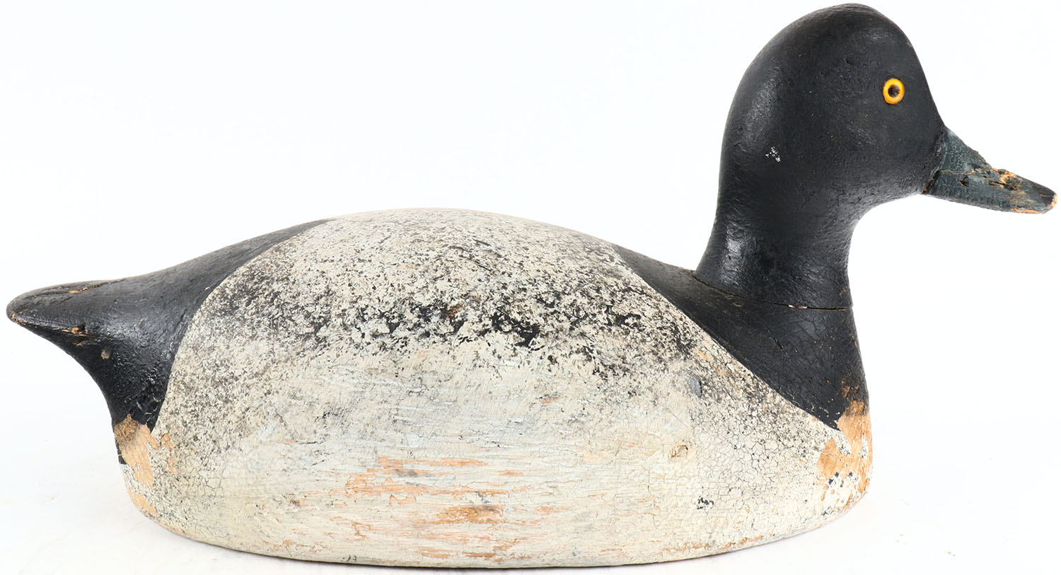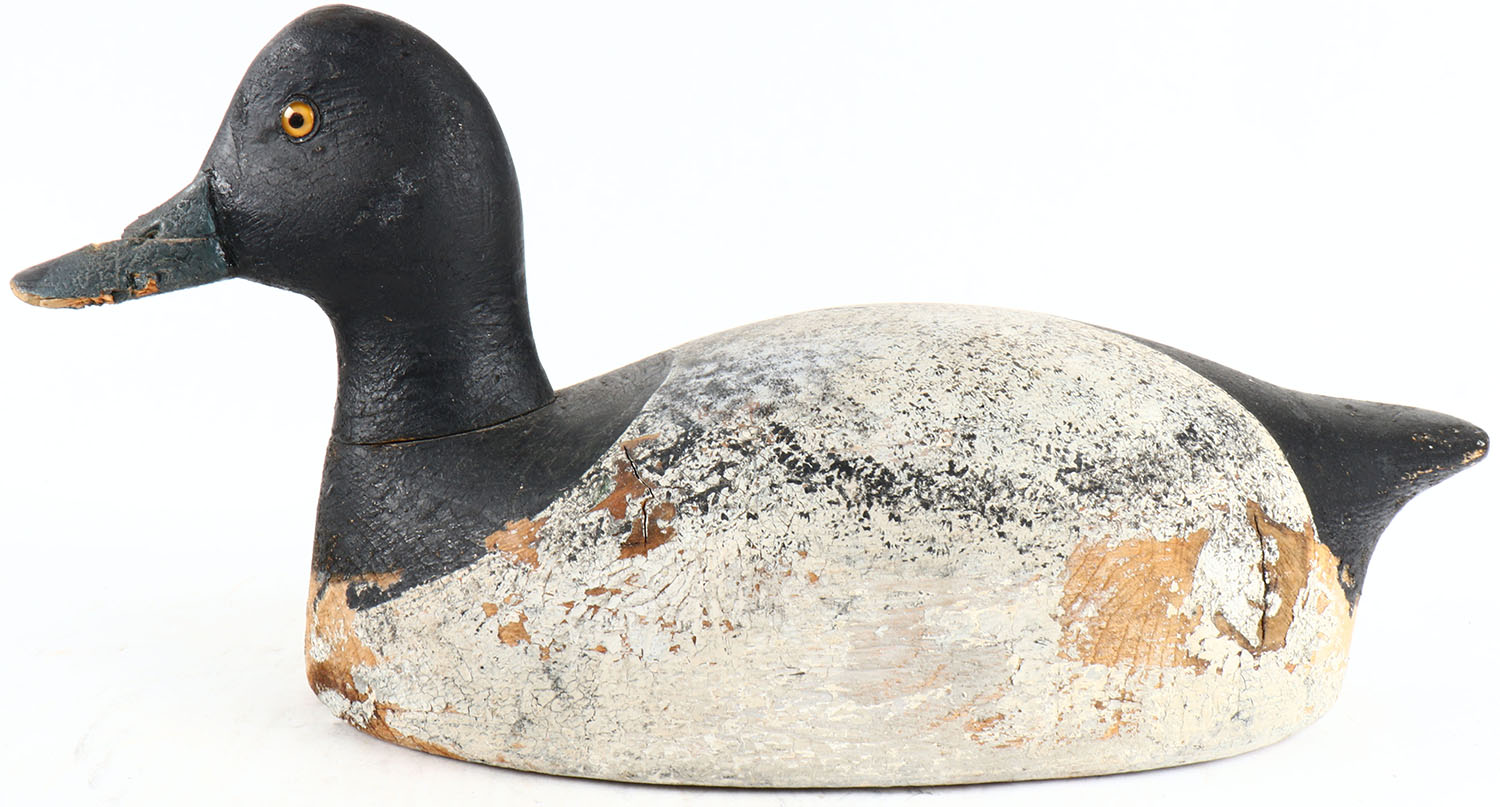 Bluebill Drake by Harold E. Wieckert, glass eyes, solid wood, bill is chipped on top, signed on bottom, original paint. Grade: Very Good ++ - Value: 30 to 200
