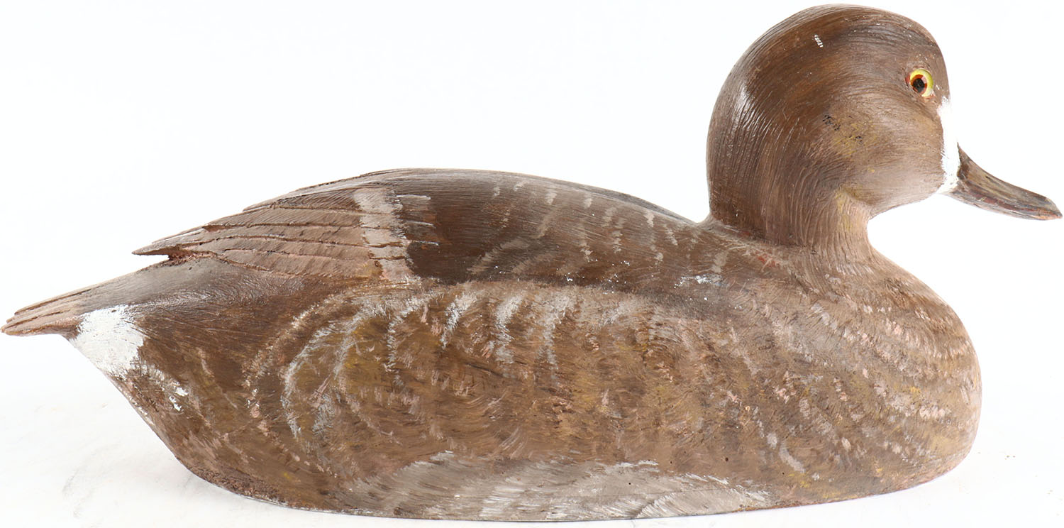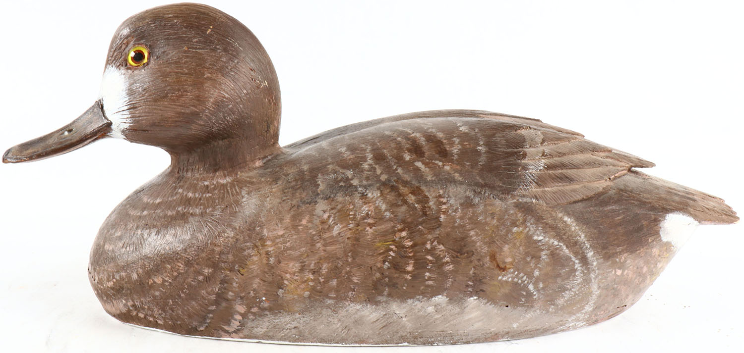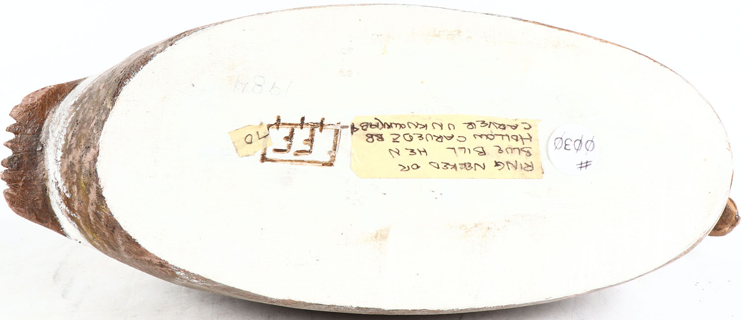 Bluebill Hen by unknown maker, glass eyes, hollow wood, structurally excellent, original paint. Grade: MINT - Value: 30 to 200
