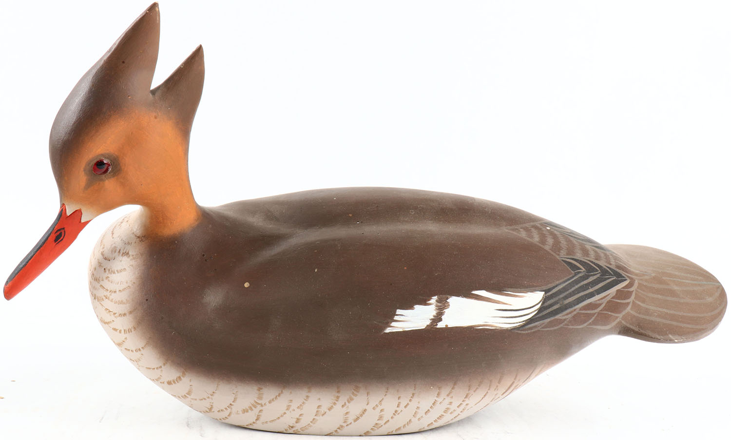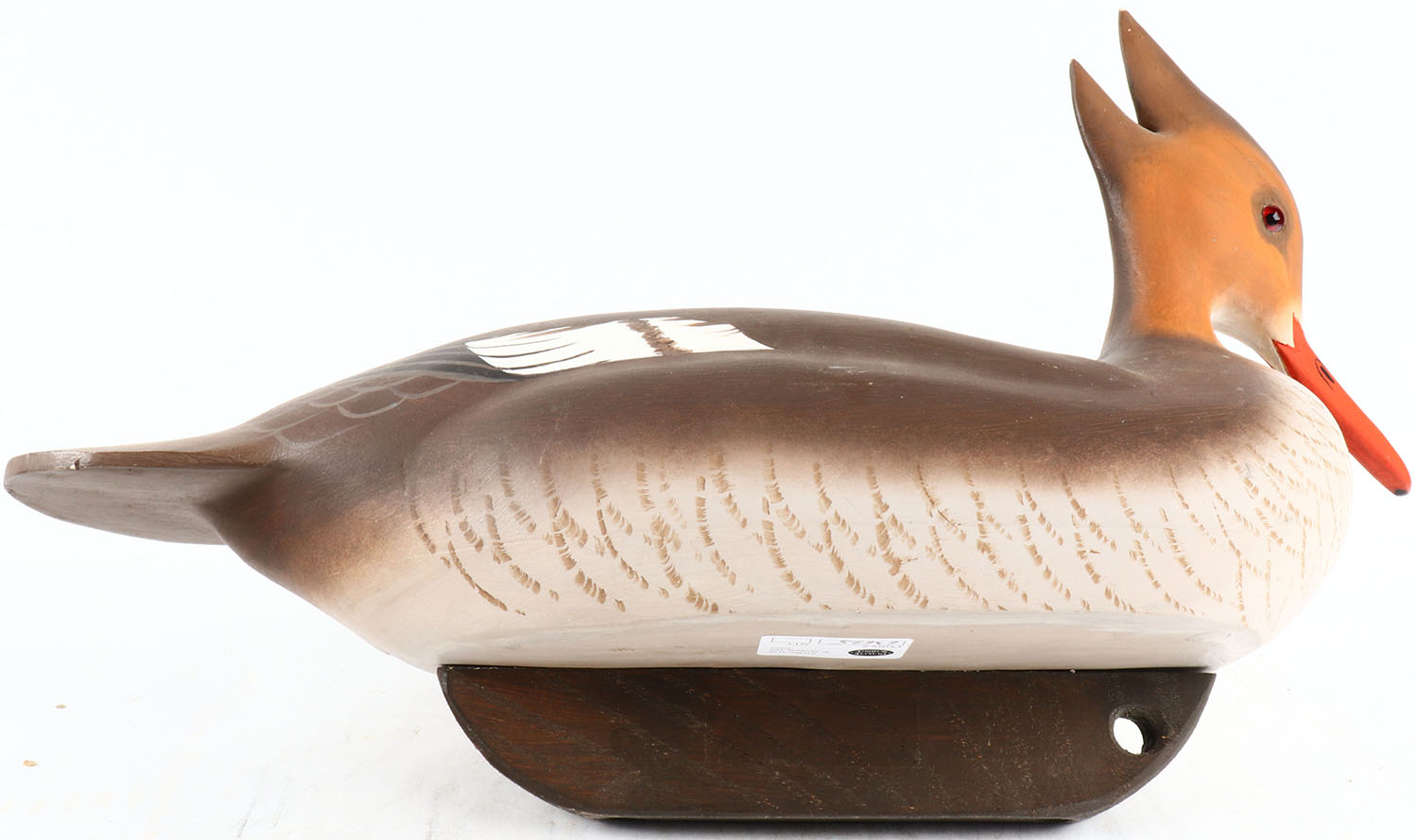Hooded Merganser by Capt. R.E. Belotem Lewes, DE, painted eyes, structurally excellent, hollow wood, signed and branded on bottom, original paint. Grade: MINT - Value: 30 to 300