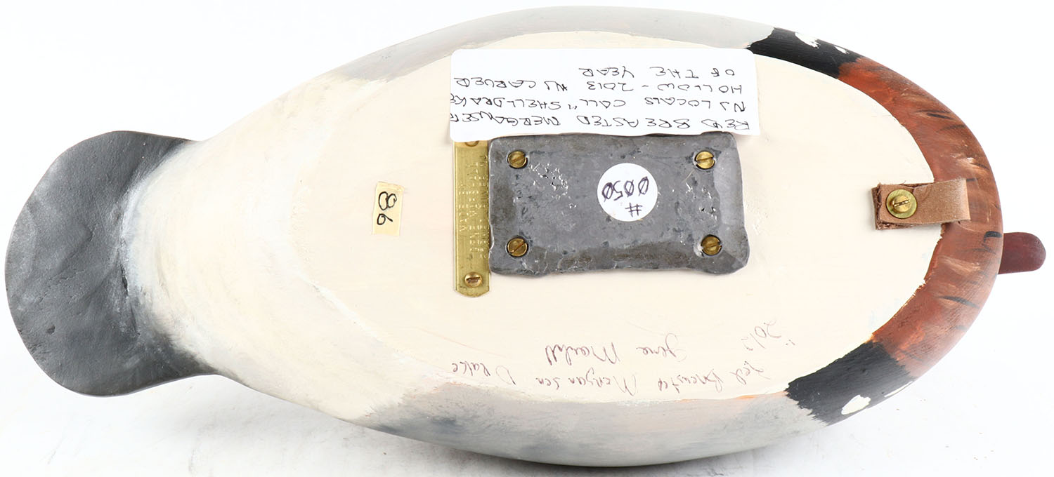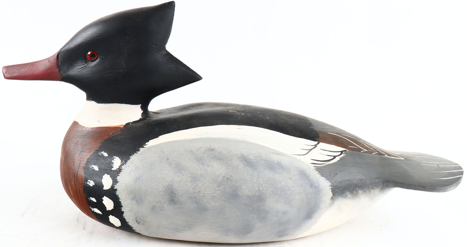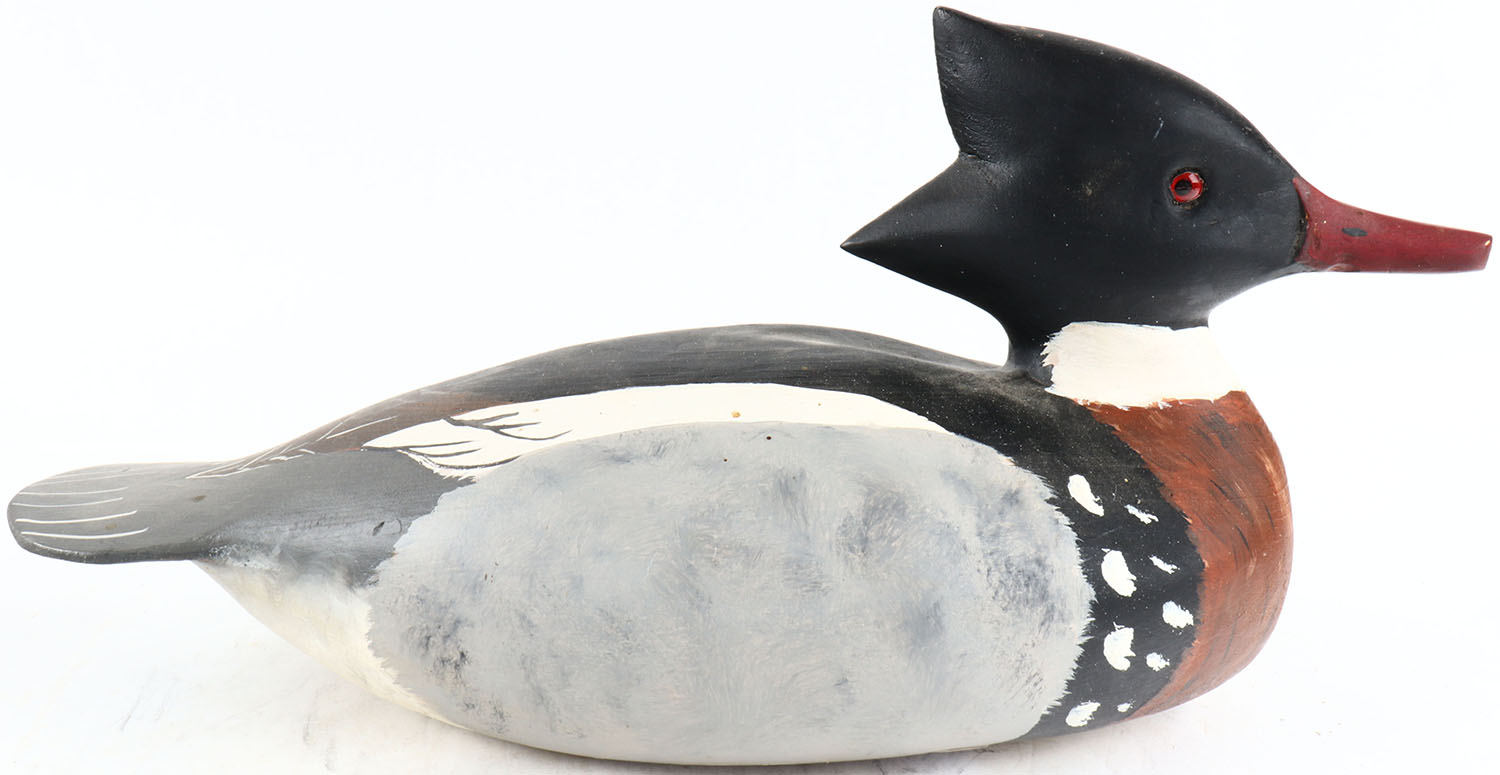 Red Merganser Drake by Gene Marshall, Forked River NJ. glass eyes, structurally excellent, hollow wood, signed on bottom, original paint. Grade: MINT - Value: 30 to 150