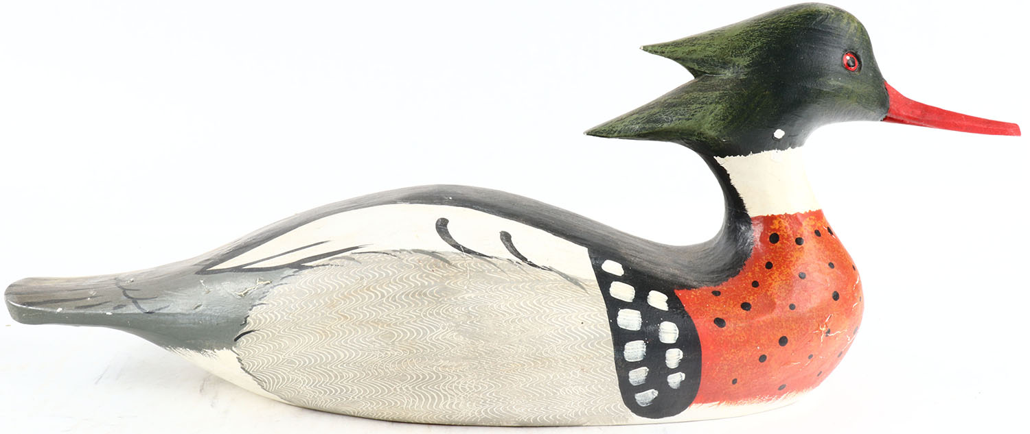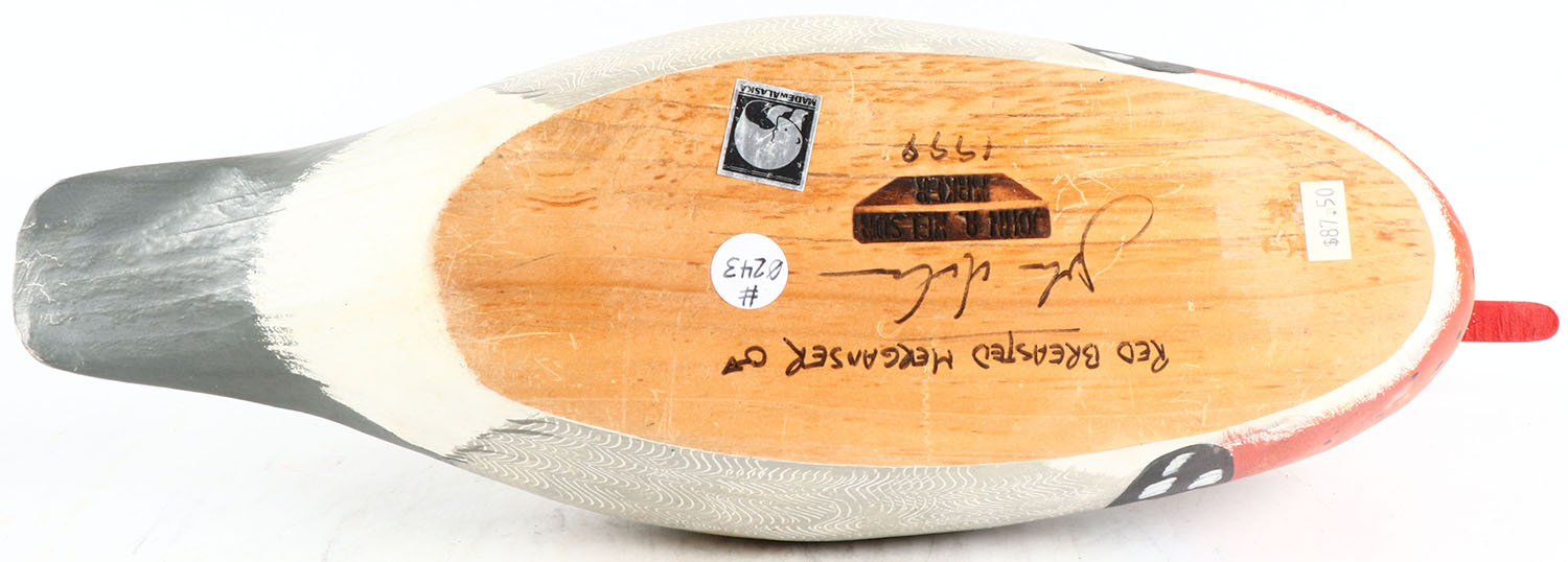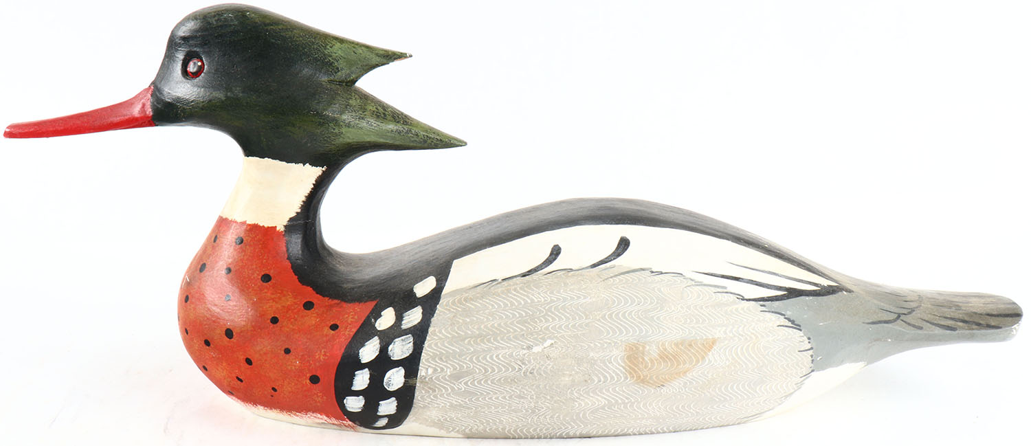 Red Breasted Merganser by John A. Nelson, glass eyes, structurally excellent, solid wood, signed on bottom, original paint with comb painting. Grade: MINT - Value: 16 to 60
