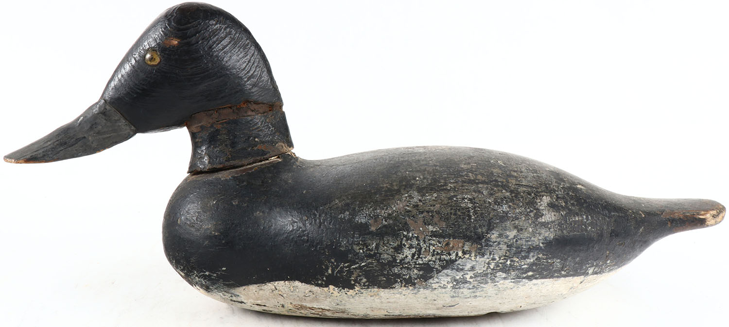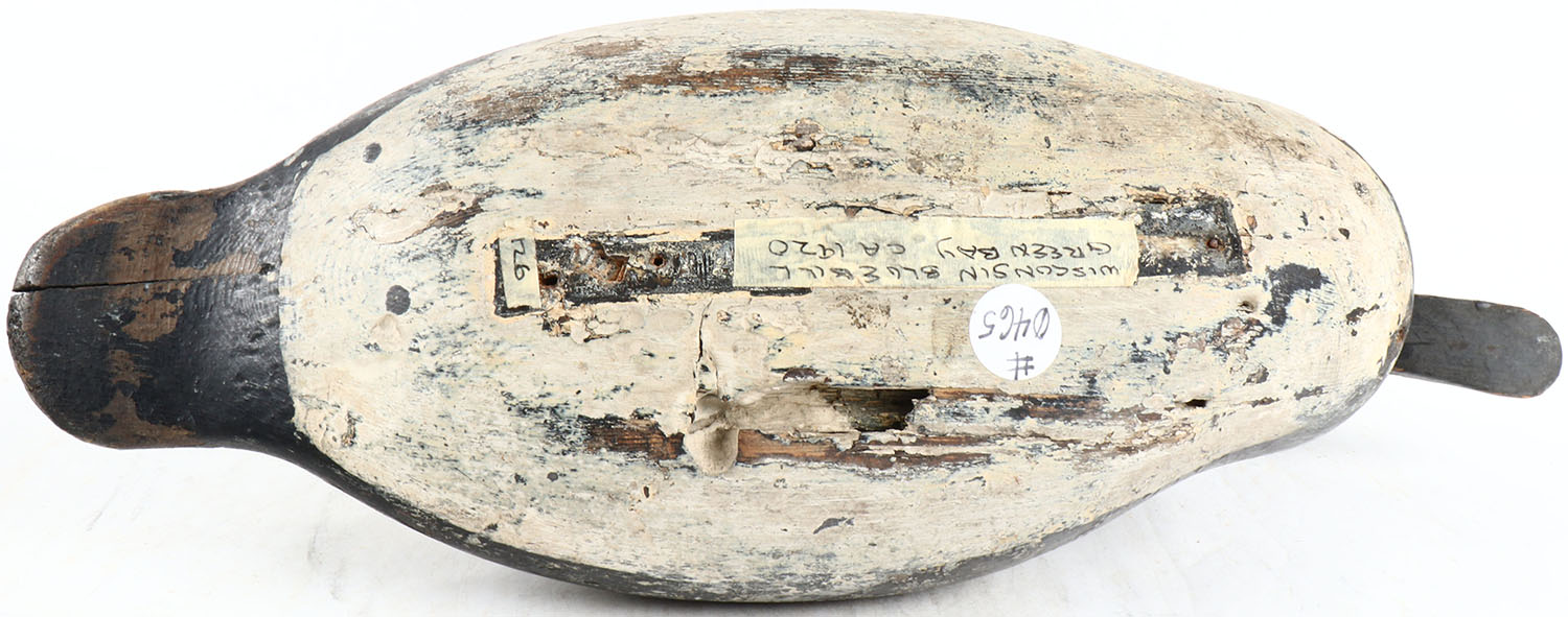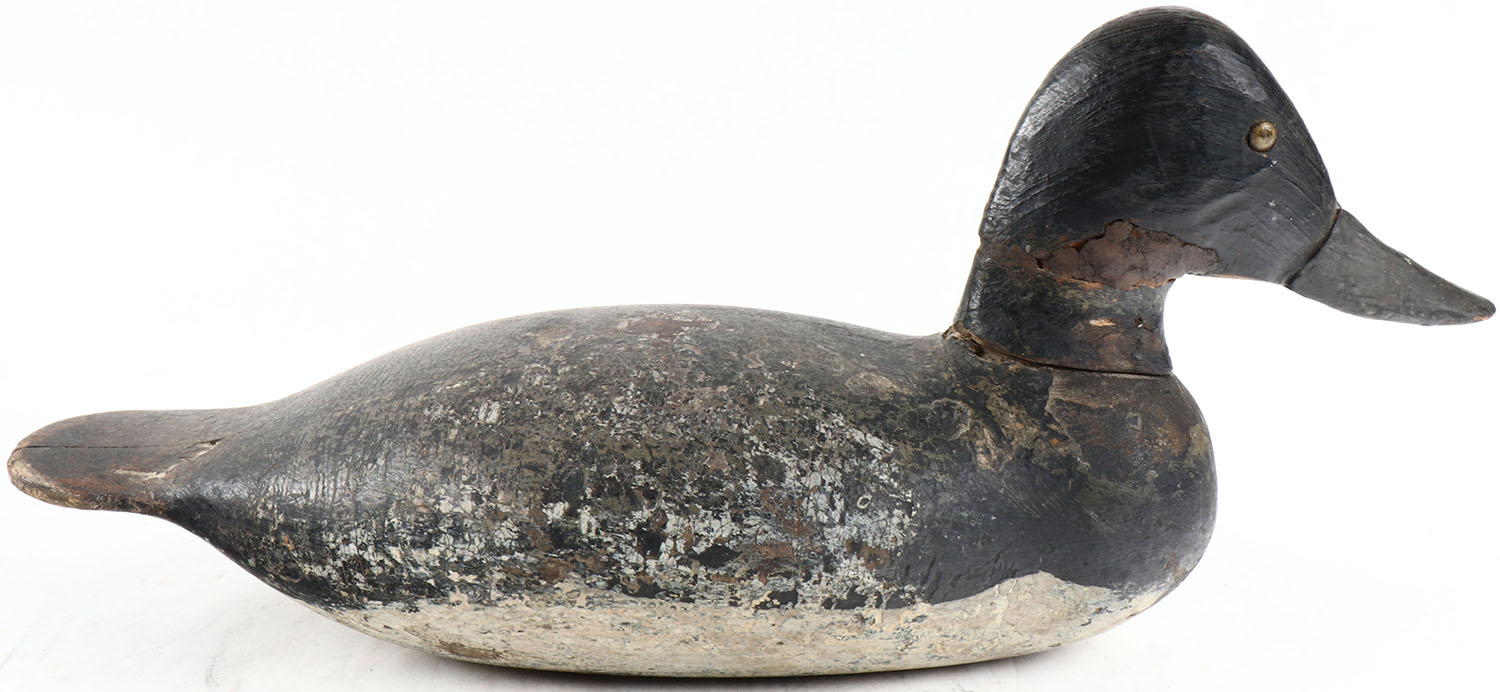 Bluebill Drake by unknown maker, Green Bay WI. tack eyes, has age cracks on tail and around neck, solid wood, original paint. Grade: Very Good ++ - Value: 16 to 60