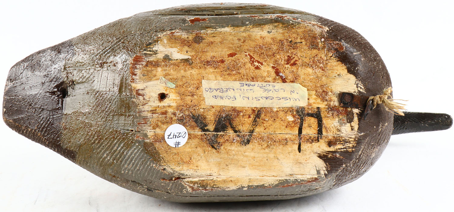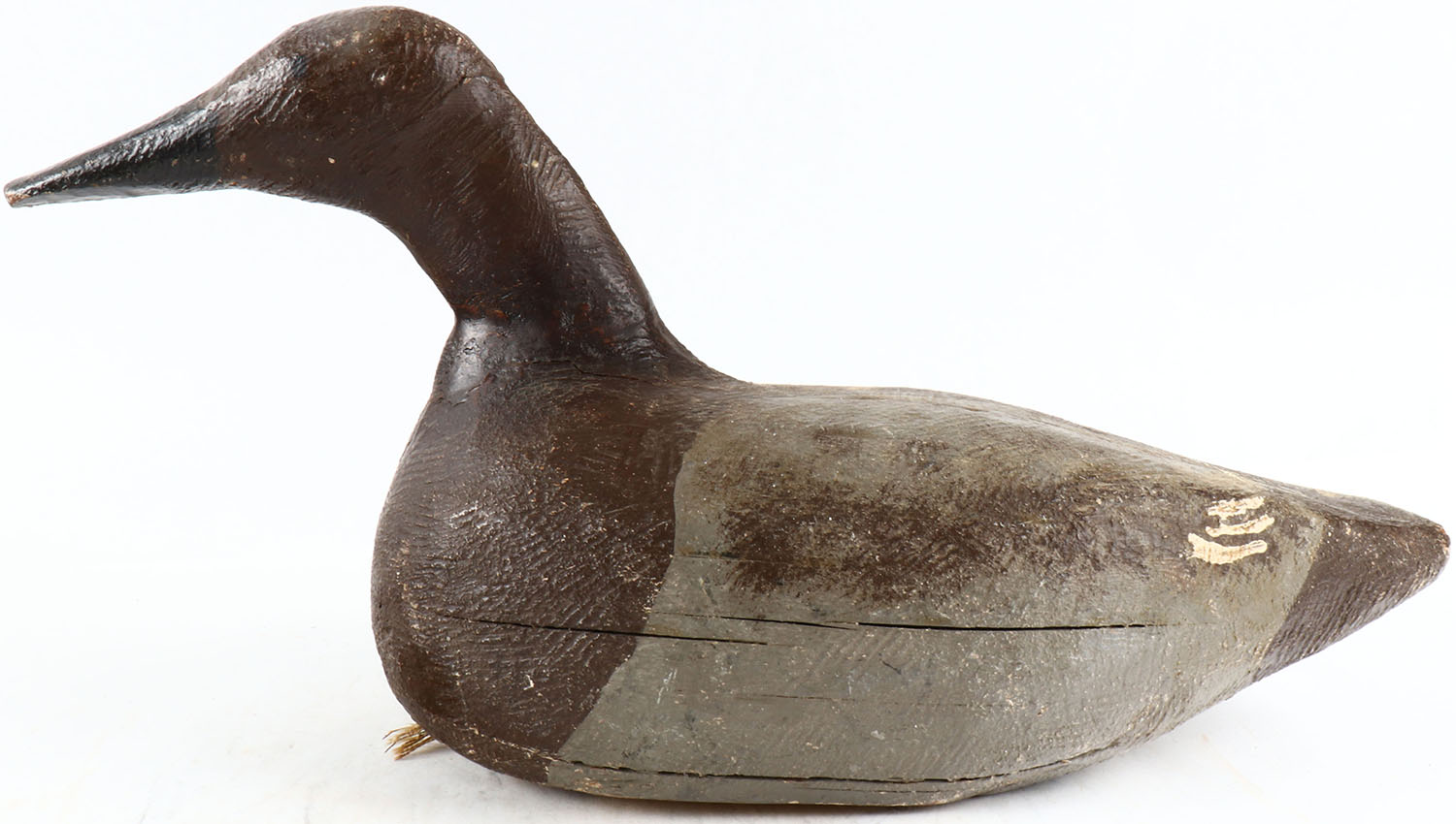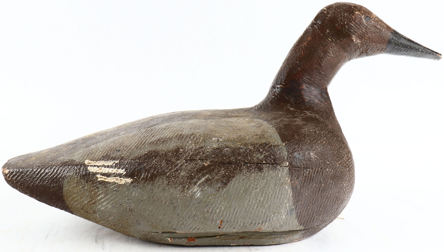 Canvasback Drake by unknown maker, Wisconsin, Lake Winnebago Cottage, painted eyes, solid wood, original paint, has age cracks on body. Grade: Excellent - Value: 26 to 100